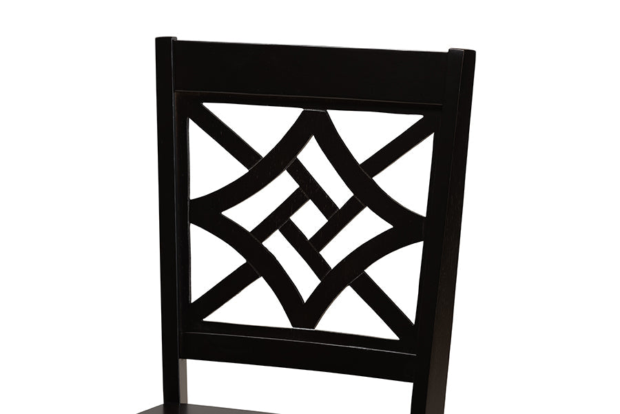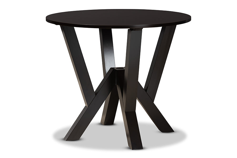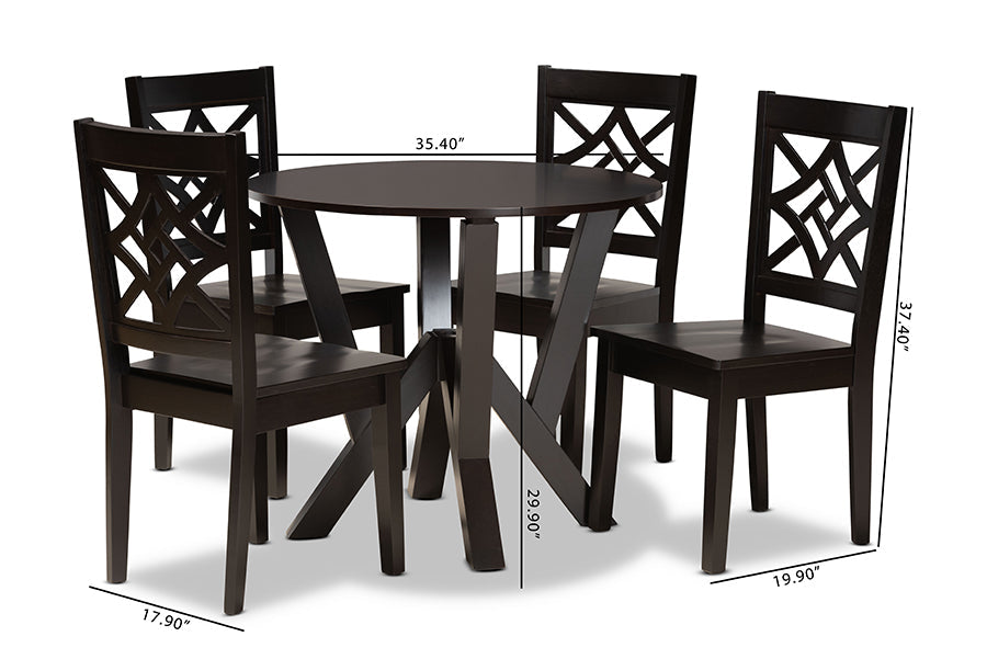 Add crisp, contemporary design to your dining space with the visually striking Harding dining set. Made in Malaysia, this wooden set includes four dining chairs and one dining table finished in a rich dark brown hue. Each chair is fitted with a smooth scoop seat for casual comfort and features a unique, geometric cut out design for enhanced visual appeal. Requiring assembly, the circular tabletop provides ample elbow room for each member of the table. Perfect for both casual and formal dining, the Harding dining set is an excellent addition to the modern home.
