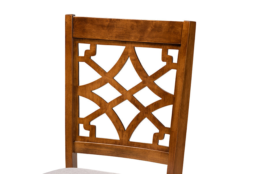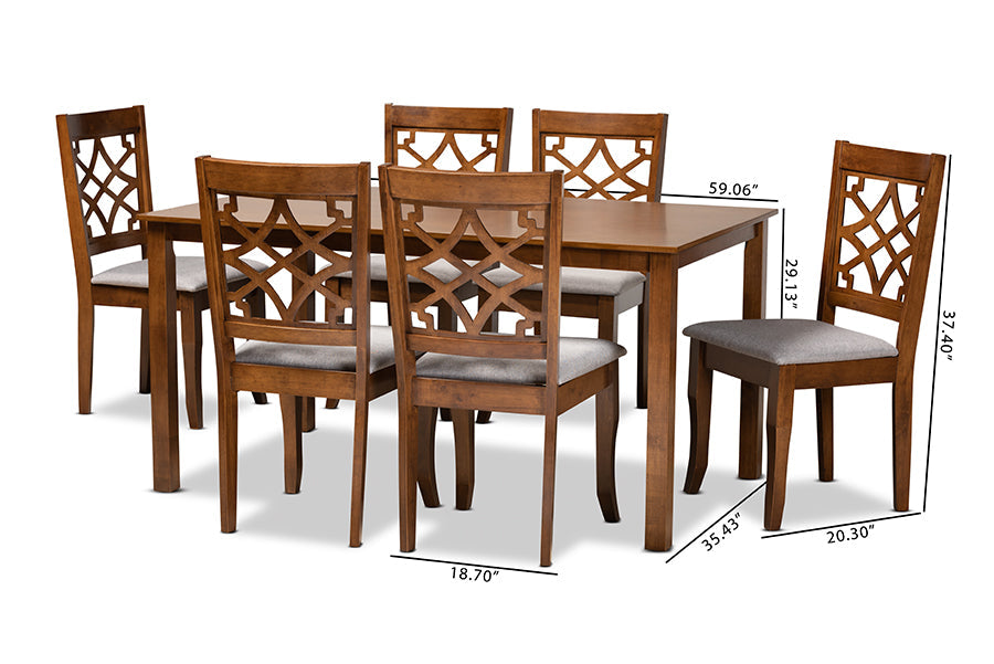 Cultivate an air of elegance in your dining room with the Meike dining set. Made in Malaysia, this dining set is constructed from wood and includes one table and six chairs, each upholstered in a light fabric that complements the warm walnut brown wood finish. Designed with both comfort and style in mind, each chair features a plush foam-padded seat, as well as an exquisite cut-out design on its back. The Meike requires assembly and is supported by saber legs for a classic, refined touch. Equally suitable for both chic dinner parties and casual family dinners, the Meike dining set is sure to enhance any dining experience.