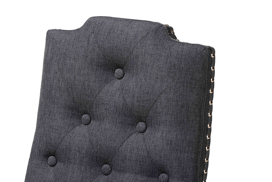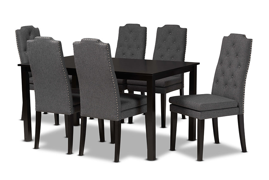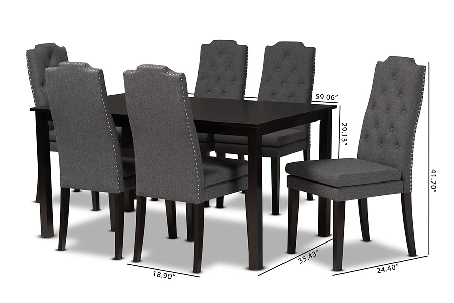 Transform every meal into a luxurious occasion with the stunning Newcastle dining set. Made in Malaysia, this dining set includes six chairs and one table constructed from dark brown finished wood. Each chair is upholstered in smooth fabric for superb comfort while button tufting on the backrest lends a graceful touch. Requiring assembly, the Newcastle utilizes a large, rectangular tabletop that comfortably seats six. Silver finished metal nailheads outline the chairs with dazzling style, making the Newcastle dining set a magnificent addition to any dining space.