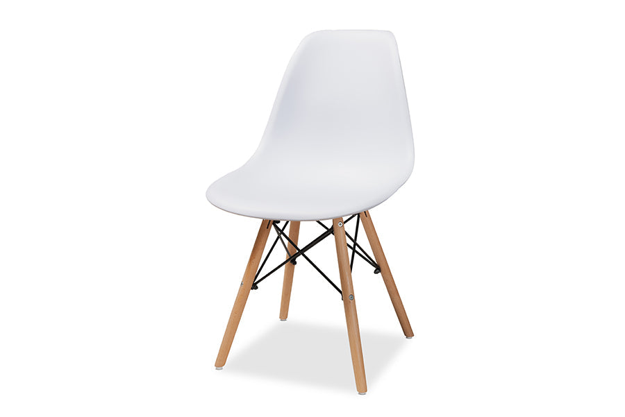 Design a chic layout in your dining room with the stylish Malina dining set. Made in China, this set includes four dining chairs and one table. Each chair features a sturdy wood and metal base fitted with a smooth polypropylene plastic seat. Black finished metal crisscross support bars ensure excellent stability while lending a cool, industrial look that complements the oak brown finish on the wood. Requiring assembly, the coordinating table features a circular tabletop that provides ample elbow room for each member at the table. A unique expression of modern minimalism, the Malina dining set stands out as a fashionable addition to any dining space.