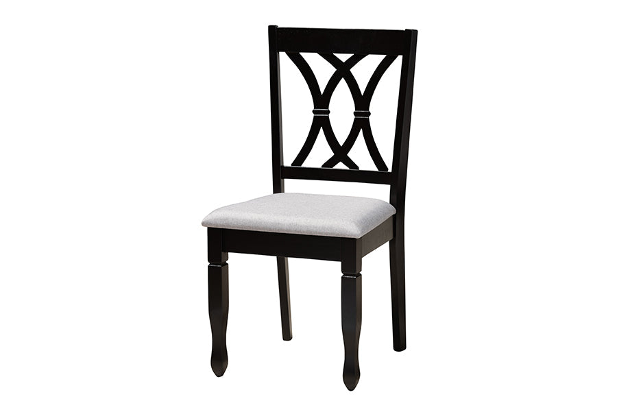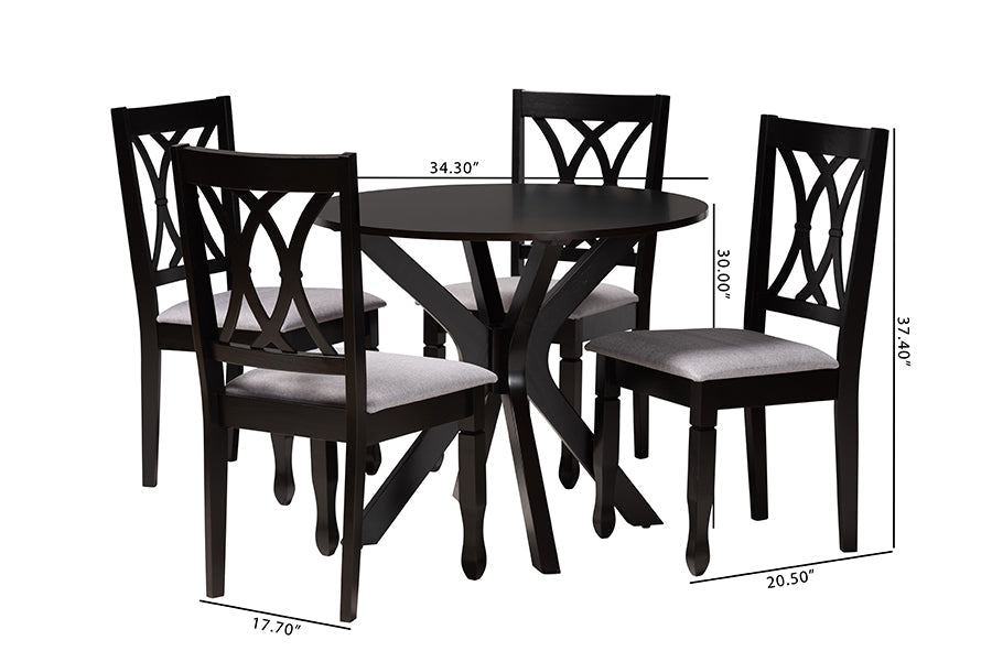 Cultivate an air of sophistication in your dining room with the stunning Linn dining set. Made in Malaysia, the set includes four dining chairs and one table constructed from sturdy wood. Each chair is fitted with a foam-padded seat and upholstered in smooth fabric as well as a captivating cut-out design on the backrest. Requiring assembly, the large, circular tabletop ensures plenty of elbow room for each member of the table. Demonstrating unique yet refined craftsmanship, the Linn dining set brings elegance to any dining room.