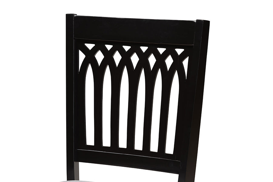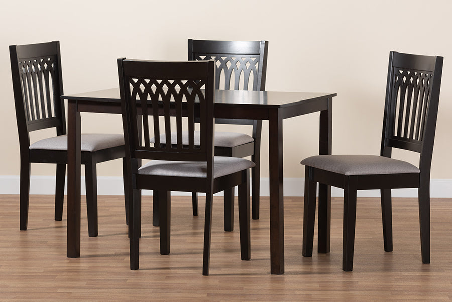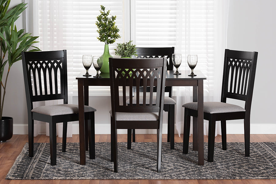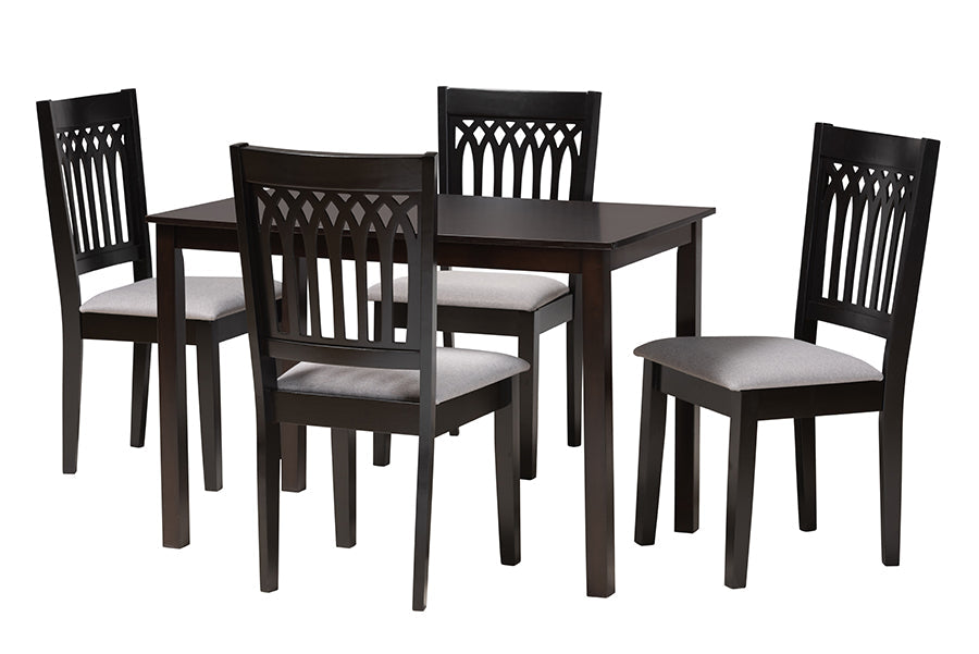 Permeate every occasion with an air of elegance with the exquisite Oteria dining set. Made in Malaysia, this modern set includes four chairs and one table crafted from sturdy wood. Each chair features a plush foam-padded cushion upholstered in fabric as well as a beautiful twist on the classic spindle backrest. The Oteria requires assembly and features a rectangular tabletop with sleek edges to offer ample room for each member of the table. Tapered legs offer sleek geometry, making the Oteria dining set a refined centerpiece for any arrangement.