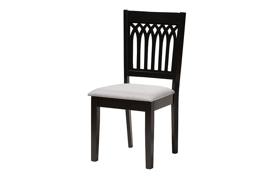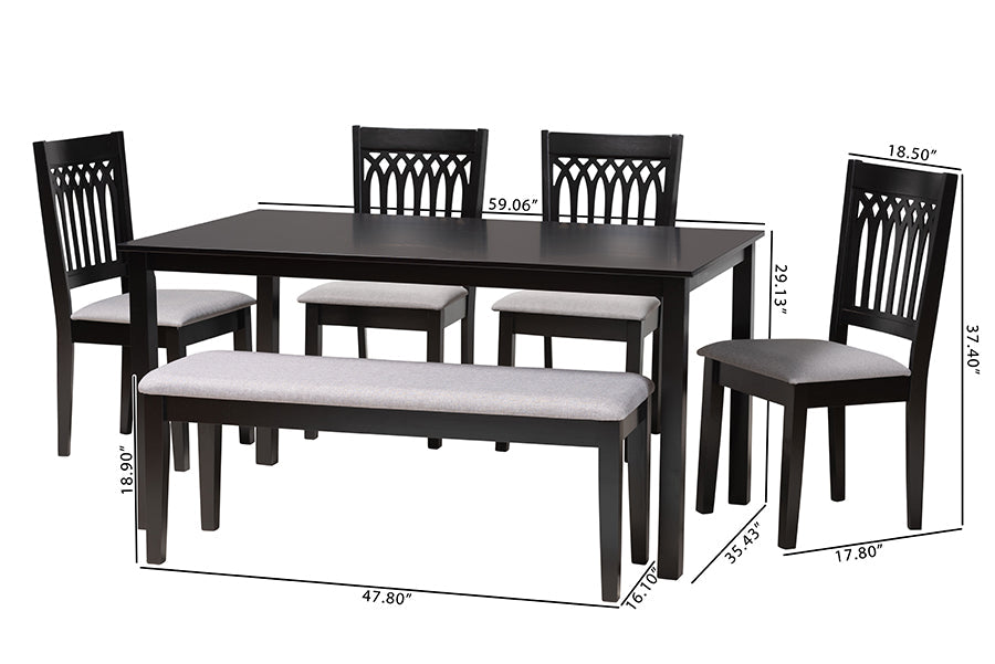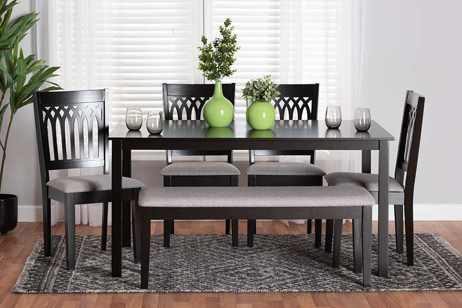 Permeate every occasion with an air of elegance with the exquisite Oteria dining set. Made in Malaysia, this modern set includes four chairs, one bench, and one table crafted from sturdy wood. Each seat features a plush foam-padded cushion upholstered in fabric as well as a beautiful twist on the classic spindle backrest. The Oteria requires assembly and features a rectangular tabletop with sleek edges to offer ample room for each member of the table. Tapered legs offer sleek geometry, making the Oteria dining set a refined centerpiece for any arrangement.