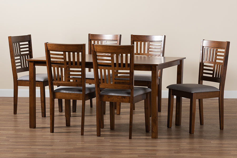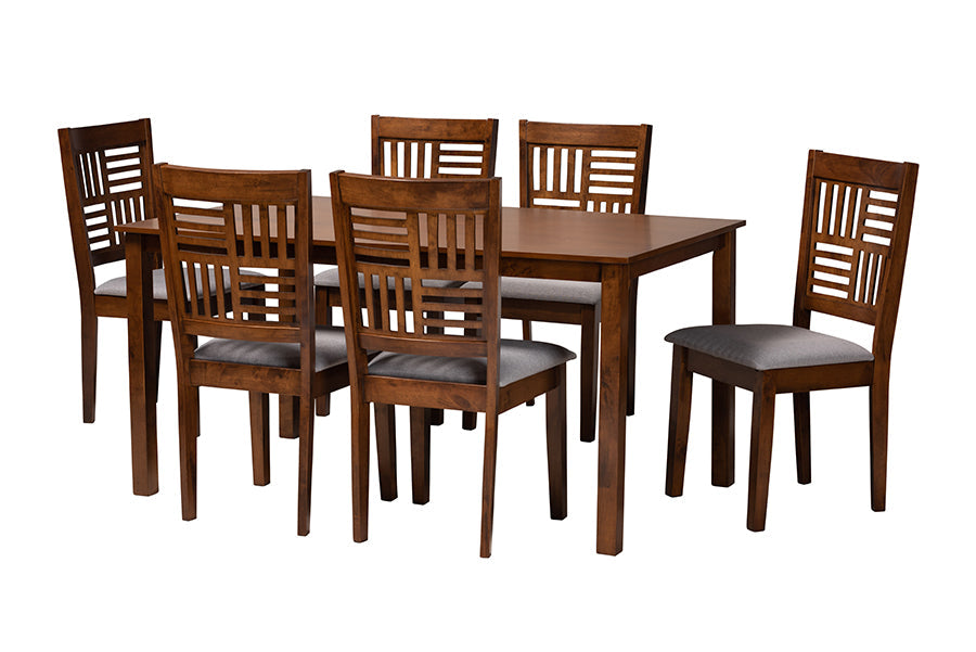 Exuding geometric flair, the Marin dining set evokes an air of sophistication. Made in Malaysia, this modern set includes six dining chairs and one table comprised of a sturdy wood. Each seat features a plush, foam-padded cushion upholstered in fabric as well as a beautiful slatted wood backrest. The Marin requires assembly and features a rectangular tabletop with crisp edges to offer ample room for each member of the table. Eliciting sleek serenity, the Marin dining set elevates any space.