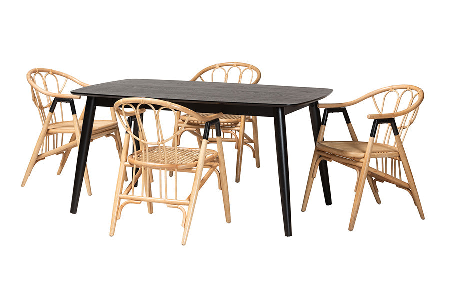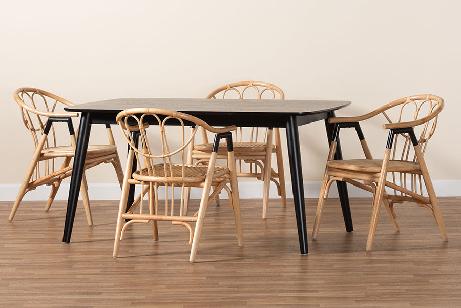 Develop an aura of natural elegance in your space with the boho flair of the Leland dining set. Made in Indonesia, this bohemian set includes four chairs and one table. Each chair is handcrafted from natural rattan and is fitted with convenient armrests to encourage casual relaxation. The table of the Leland requires assembly and features a rectangular silhouette with rounded edges to provide ample space for each member of the table. Delivering a refined freshness with eye-catching geometry, the Leland dining set is sure to elevate any occasion.