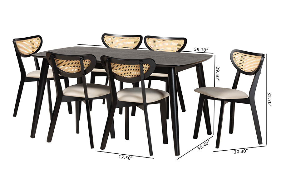 Enrich every occasion with the traditional composure of the Wren dining set. Made in Malaysia, this mid-century set includes six dining chairs and one table crafted from sturdy wood. Each seat is padded with plush foam and upholstered in soft fabric while the backrests showcase beautifully woven rattan for an invitingly cozy display. The Wren requires assembly and features a broad rectangular tabletop with smooth edges to accommodate each member of the table. Striking a poise of timeless charm, the Wren dining set creates an invigorating arrangement.