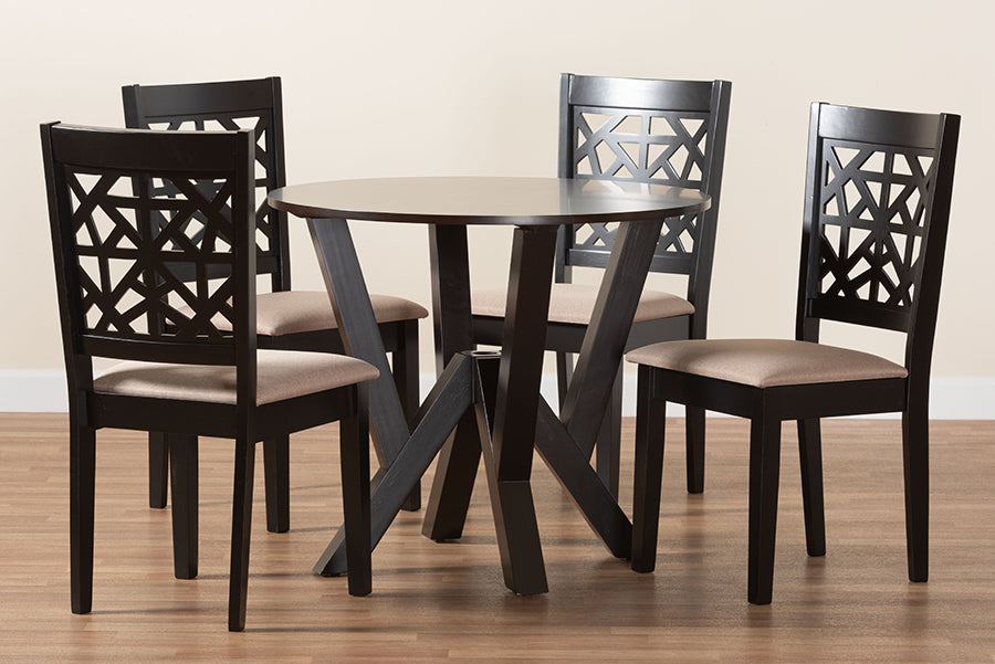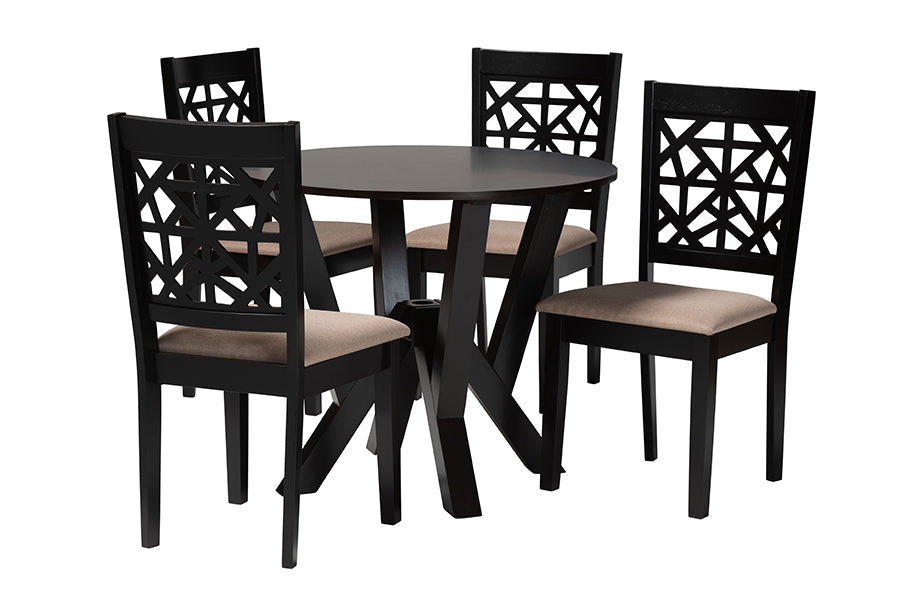 The crisp geometry and cozy design of the Gerhardine dining set elevates any occasion. Made in Malaysia, this modern set includes four chairs and one table crafted from sturdy wood. Each seat is padded with plush foam and upholstered in soft fabric while the backs of the chairs feature a unique cut-out design for a captivating display. The Gerhardine requires assembly and utilizes a round tabletop supported by an intersecting base for a chic, sculptural effect. Anchoring your arrangement with contemporary flair, the Gerhardine dining set is a remarkable arrangement.