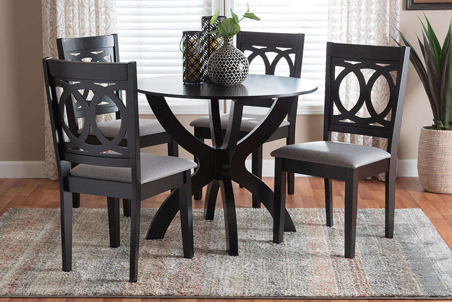 Elegant curves and crisp geometry exude serenity from the lovely Morigan dining set. Made in Malaysia, this modern set includes four chairs and one table crafted from sturdy wood. Each chair blends style and comfort with a plush foam-padded seat cushion upholstered in soft fabric as well as a captivating cutout design on the back. The Morigan requires assembly and utilizes a round tabletop to accommodate each member of the table. Striking a poise of chic refinement, the Morigan dining set is well suited for any occasion.