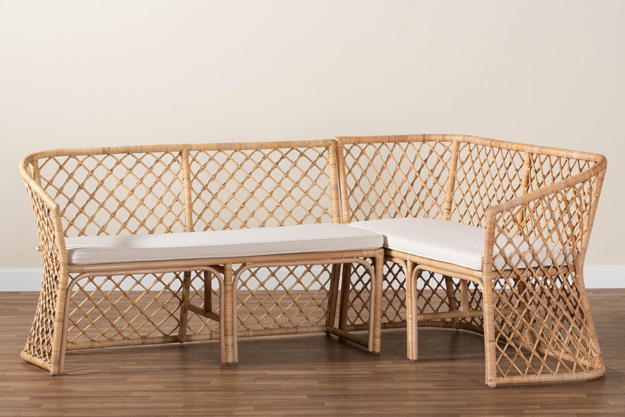 Design an arrangement rich with exotic beauty through the lovely Aysi dining nook set. Made in Indonesia, this bohemian set includes two corner benches handcrafted from sustainably sourced natural rattan. Each bench utilizes sloping armrests to encourage leisure while an airy open weave creates a lightweight design that allows light to flow naturally. The Aysi will arrive fully assembled and features removable cushions padded with plush foam and upholstered in soft fabric. A roomy and cozy presentation, the Aysi dining nook set is a remarkable addition.