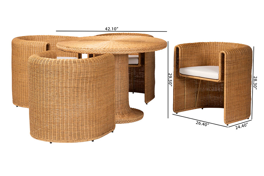 Bring an air of serenity to every meal with the beautiful Amy dining set. Made in Indonesia, this bohemian piece includes one table and four chairs handcrafted from sustainably sourced natural rattan. The classic barrel silhouettes of each chair present a soothing display with rounded arms for casual relaxation. The Amy will arrive fully assembled and features a round tabletop embellished with beautifully braided rattan bands for added flair. An exotic take on classic design, the Amy dining set adds tranquility to every occasion.