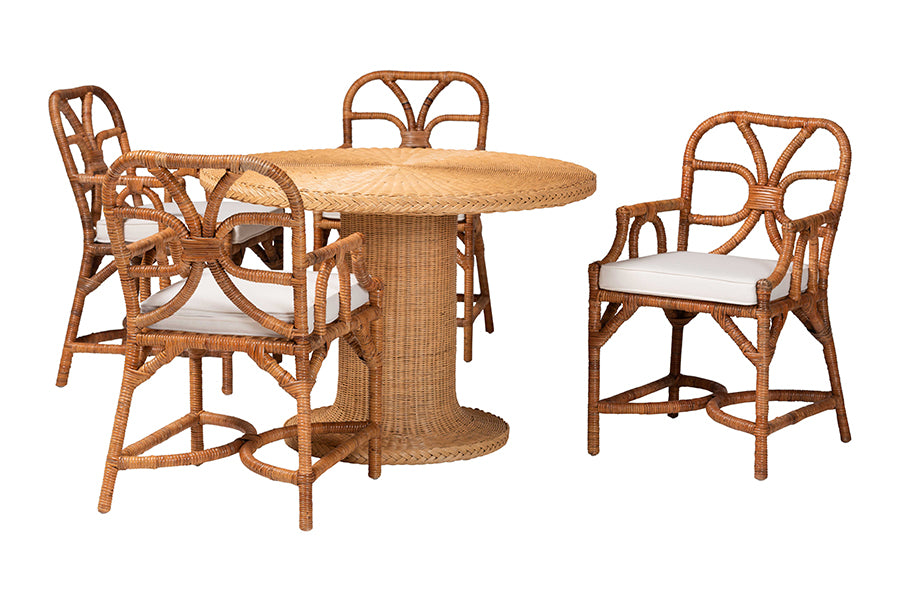 Product Dimensions: Overall Table: 42.10" W x 42.10" D x 29.50" H; Tabletop: 0.20" Thick;;Overall Chair(s): 21.80" W x 24.80" D x 35.00" H; Seat(w/o removable cushion): 18.10" W x 18.50" D x 17.70" H(from floor); Arms(from floor up): 25.60"; Backrest w/o removable cushion(from seat up): 17.30"; Chair Clearance(floor to cross stretchers): 4.70";Handwoven Rattan : Elegantly arranged natural rattan adds coastal charm with a light airy aestheticDurable Construction : Constructed from Natural Rattan, Mahogany Wood, and Engineered Wood Openwork Backrest : The decorative loops of the frame create a vibrant design while showcasing the texture of the rattan Braided Detailing : The tabletop and chairs is distinguished with braided rattan edges for a captivating display Removable Cushions : Padded with plush foam and upholstered in sumptuous fabric Fully Assembled : Each piece of this dining set arrives ready for use Set Includes: One (1) Dining Table; Four (4) Dining Chairs