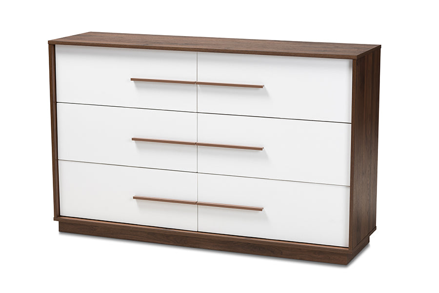 With its sleek design and exceptional craftsmanship, the Kamal dresser is a stylish addition to any bedroom. Constructed from engineered wood, the Kamal showcases a two-tone white and walnut brown finish for a cool, contemporary feel. Six drawers provide ample space to store clothes, linens, and more. Each drawer is fitted with metal glides for smooth movement. Elongated PVC handles complete the clean, streamlined look of this nightstand. The Kamal dresser is made in Malaysia and requires assembly.