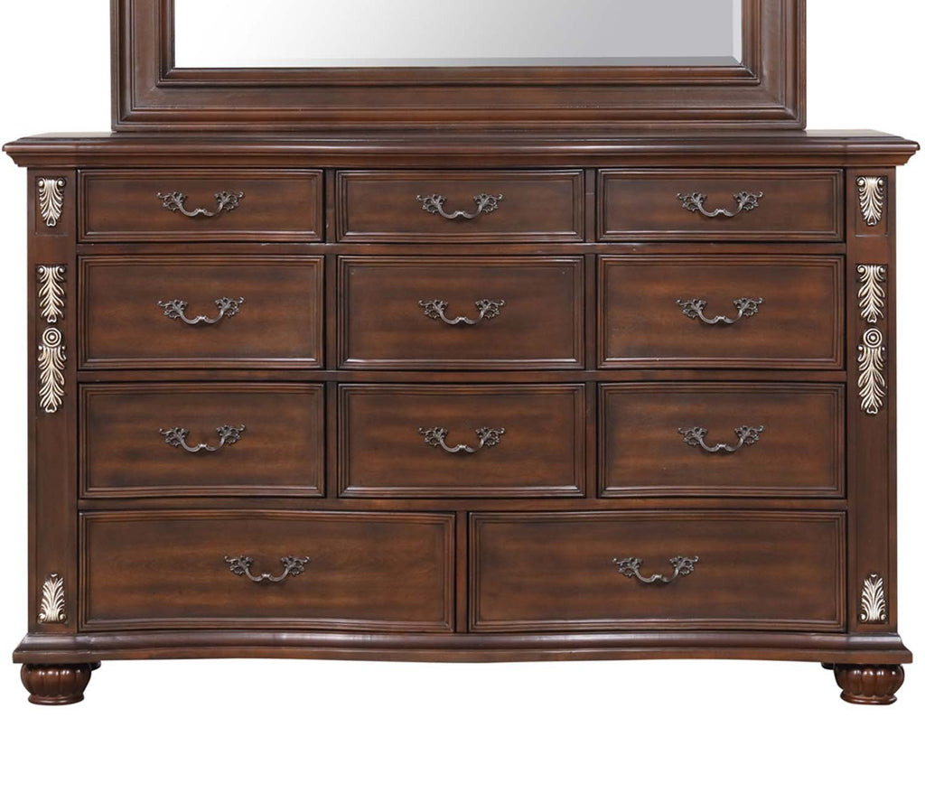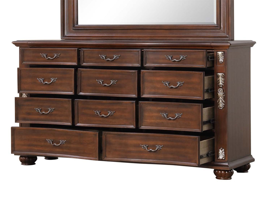 Real wood Veneers are Layered on Top of Oversize Cases. Drawer Fronts Feature Deep Grain Wood Panels Surrounded by Gold Hand Painted Accents . Smooth Drawer Operation with Side Mounted Ball Bearing Drawers that include Velvet Lining on the Top Drawer.