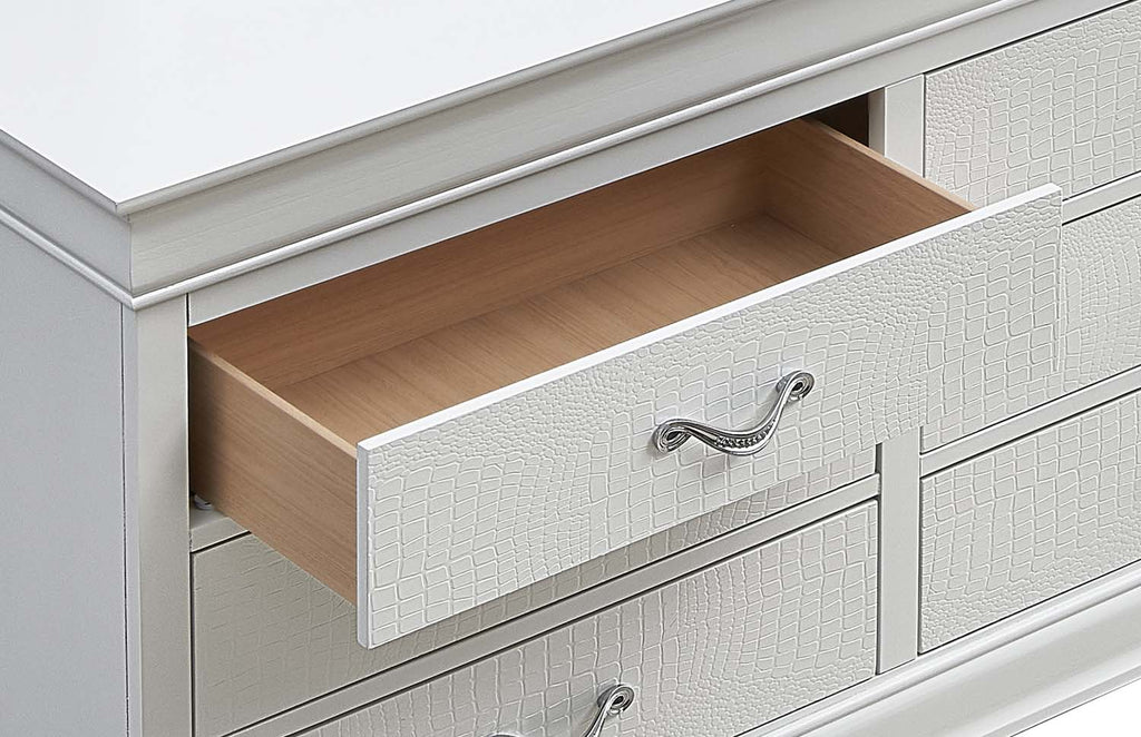 - Silver Champagne "Croc " Finish Highlights this Bedrrom Group. Beds are available in Twin ,Full, Queen and King. Wood veneers and Deep Finishes add Value and Style. Fully Asssembled Case pieces !