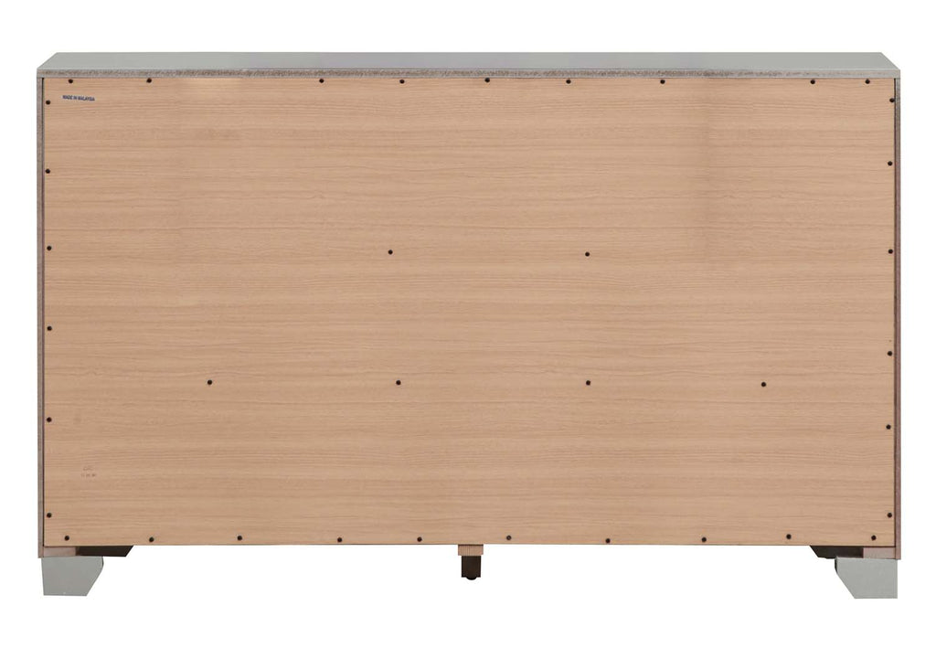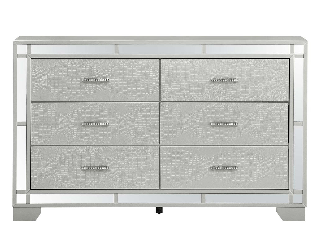 The Madison Bedroom Group Features a Textured "Croc"Front Finished in A Silvery Champagne. Mirror Trim on the Case Front and Faux Jeweled Handles Makes this Piece Sparkle! Fully Assembed and Safely Constructed with Anti Tip Anchor Supplied.