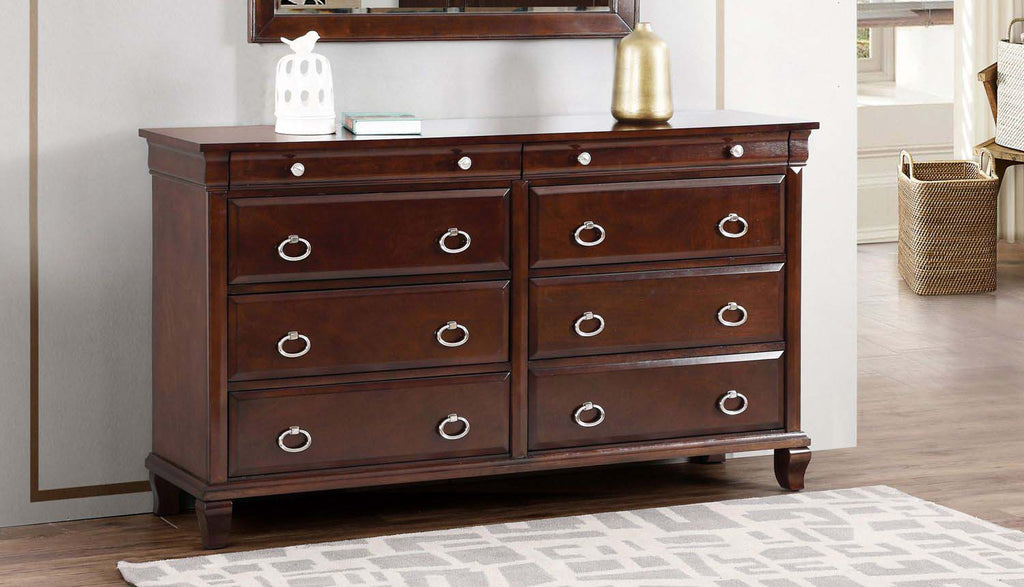 Assembled Bedroom Dresser is Finished in Real Wood Veneers over Manufactured and Solid Wood. Drawers Move on Center Supported Metal Guides and Are Dovetailed Front and Back. Corner Blocks are utilized to Support Drawer Bottoms. Choose from a Variety of Colors. Additonal Case Pieces are Available as well as Matching Beds