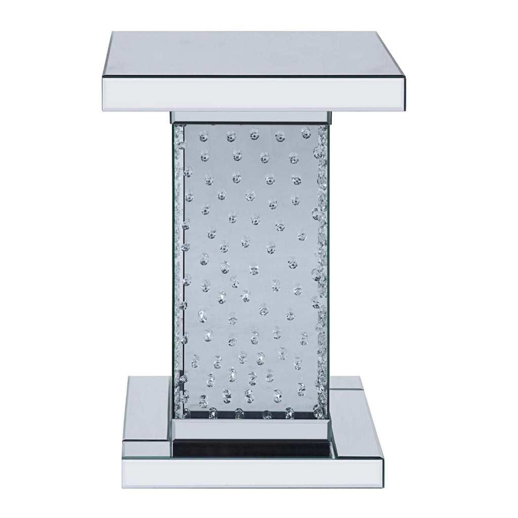 The glam Nysa end table is a dazzling way to entertain guests. The table's modern design features tempered glass resting on a fully mirrored base with crystal inlay. The mirrored base combines strong support with style, making this versatile table a welcome addition to your home.