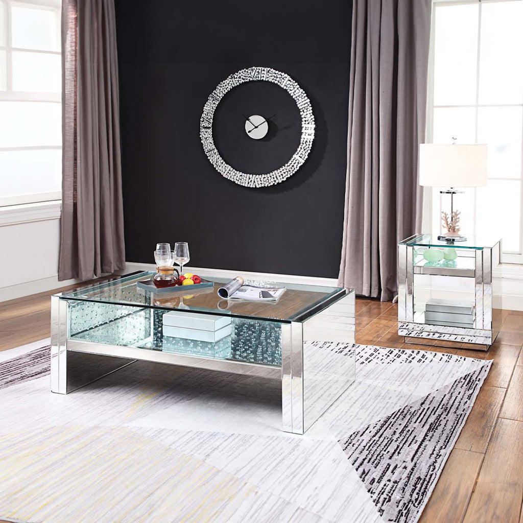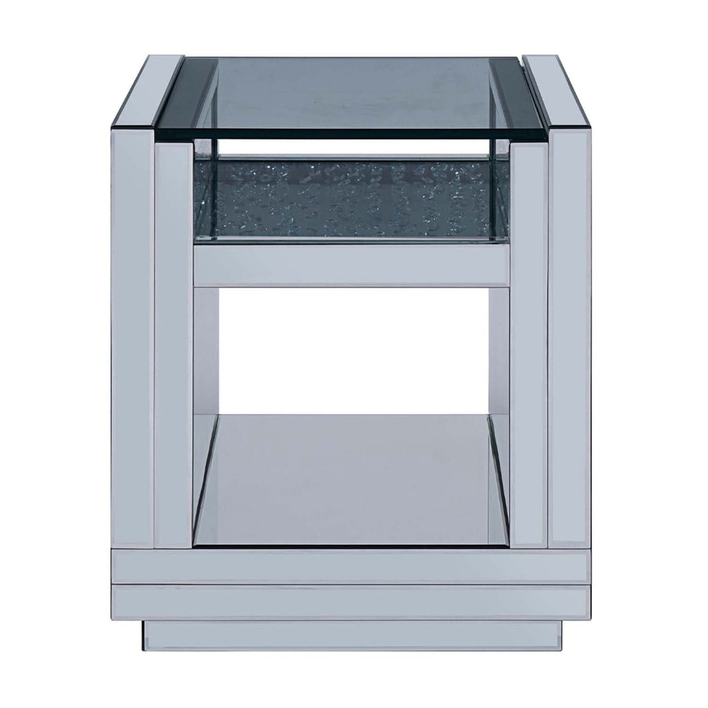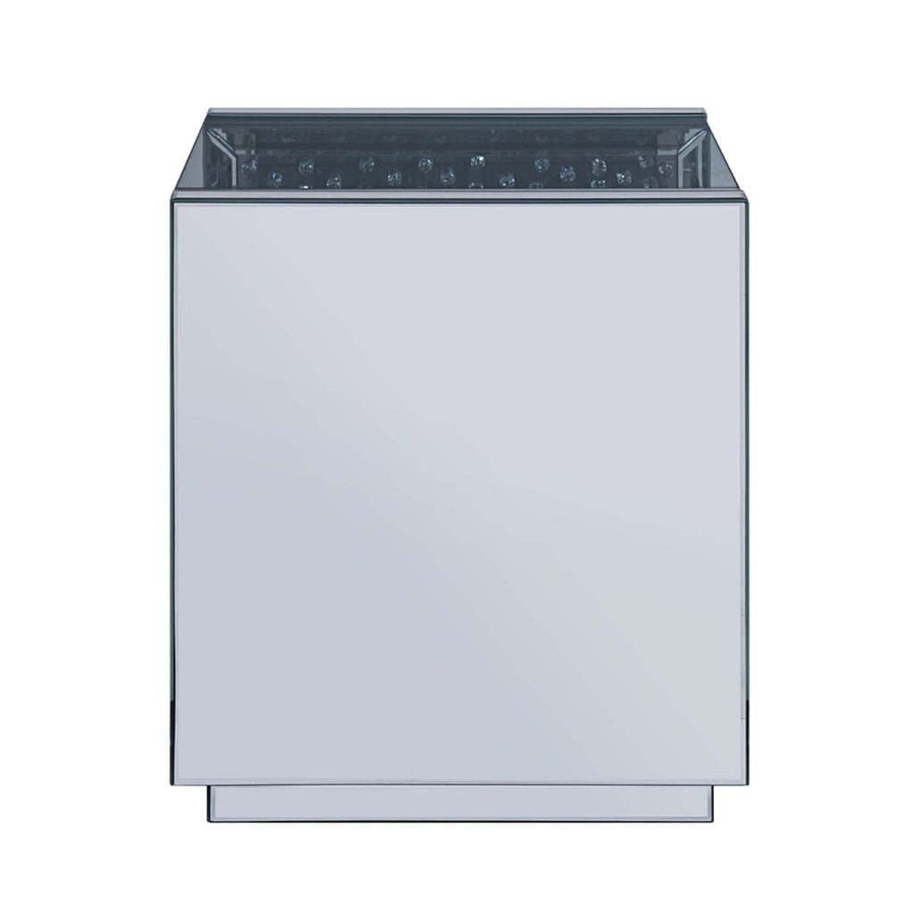 The Nysa End Table will add a contemporary touch to any room in your home. With its clean lines, this brilliant square end table showcases a distinctive style for an intriguing look. The table features a fully mirrored sled base with an exquisite beveled glass top. A lower mirrored shelf with a spectacular faux crystal inlay provides ample display and storage to keep items tucked out of the way when not in use. This beautiful accent table will modernize any space you place it.