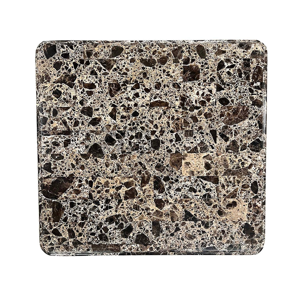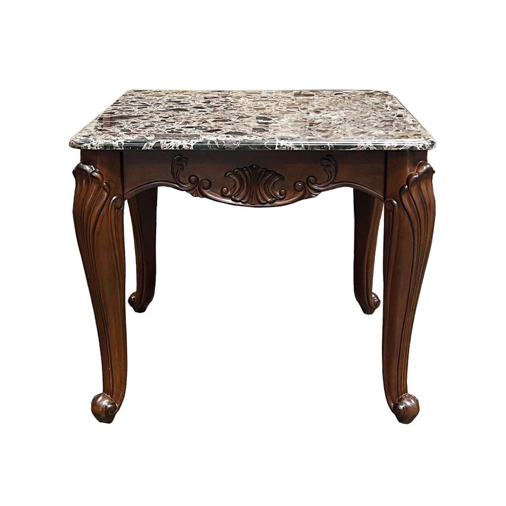 The traditional style of the Nayla end table will add elegance and sophistication to any living room. The natural granite tabletops provide a unique and durable surface that is both beautiful and functional, while the cherry finish adds warmth and richness to the overall design. The end table features a rectangular tabletop with rounded edges and beveled corners, supported by four sturdy legs that are adorned with ornate carvings and molding. The cherry finish on the legs and framework is deep and lustrous, providing a beautiful contrast to the natural granite tabletop.