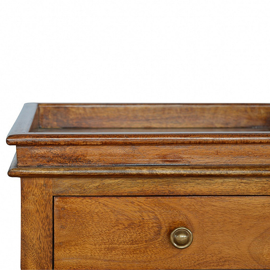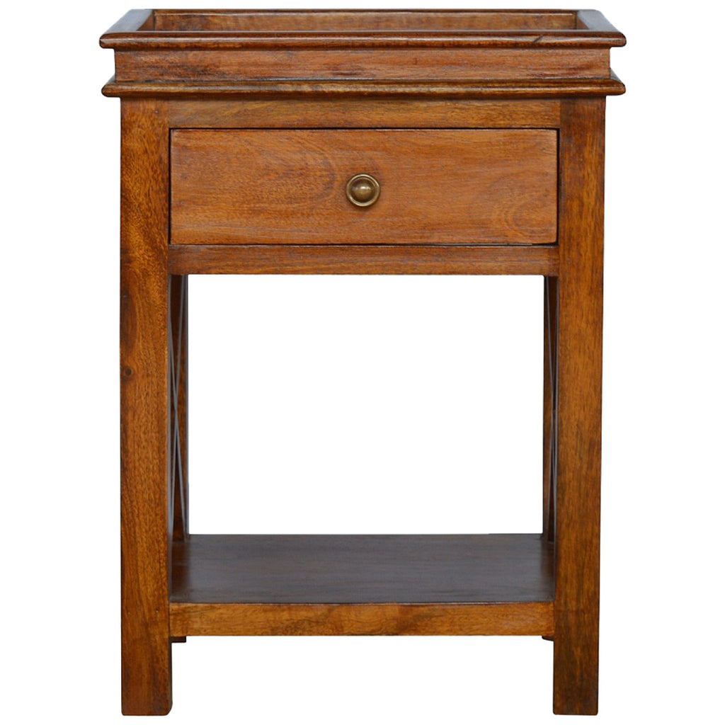 This end table has been constructed from 100% solid mango wood and finished in a beautiful chestnut colour. This product features 4 straight legs and a criss-cross design on each side of the panels. It offers some storage with 1 handy pull out drawer which has a shell handle and a small open slot to place any bits and bobs like books or magazines.