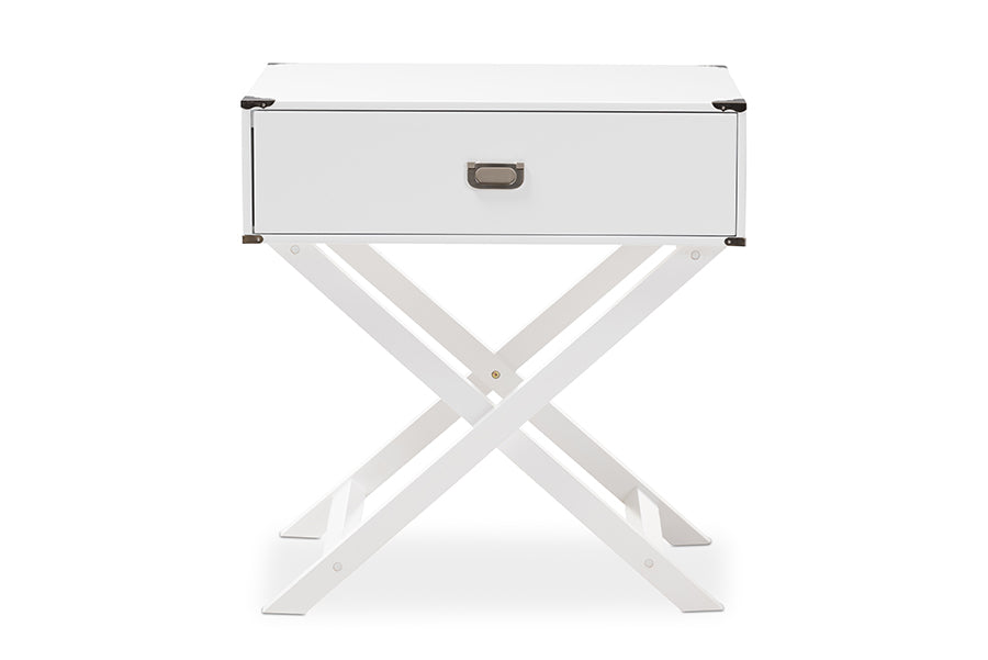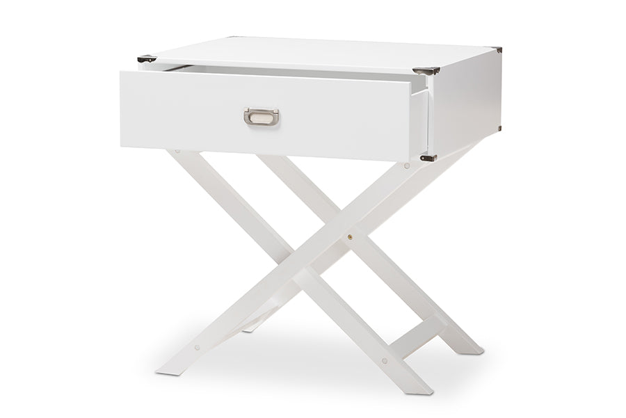 Display your novels in style by showcasing them with the wonderful Liese end table. High-density medium density board base for a sturdy and durable quality with a white paint finish for smooth, resilient style. Design features one drawer with a fixed x- base for a lamp, books and other household articles. Metal brackets and handle pulls complete the look of a modern and contemporary style. Made in China, the Liese end table requires assembly.