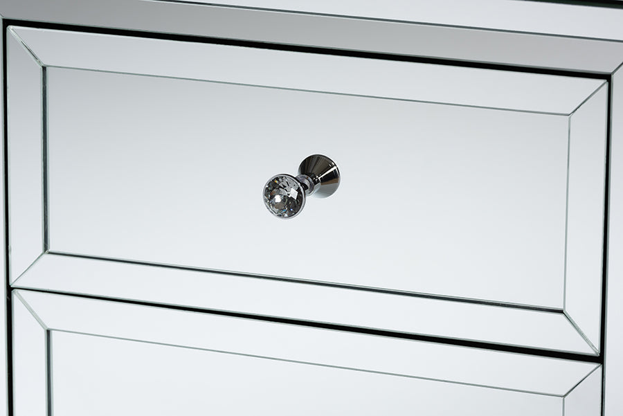 - Beveled mirrored frame surrounding the drawers