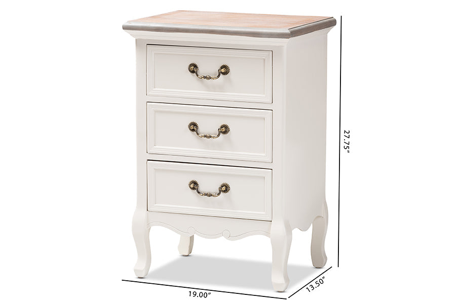 Inspired by French cottage furniture, the Gould end table is a charming addition to any interior. This wood end table features a white-washed oak tabletop, which complements the polished white finish on the drawers and legs. The tabletop features space to place books and decor, while three drawers provide storage for household essentials. Each drawer is fitted with elegant brass metal pulls for easy access. Cabriole legs add an antique-inspired touch. The Gould end table is made in China and will arrive fully assembled.