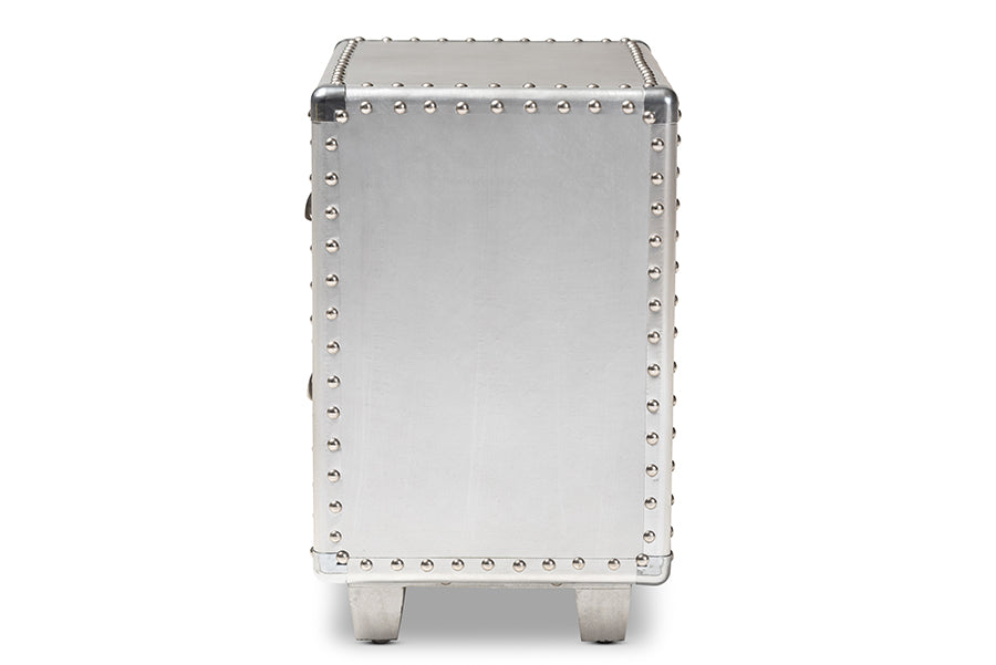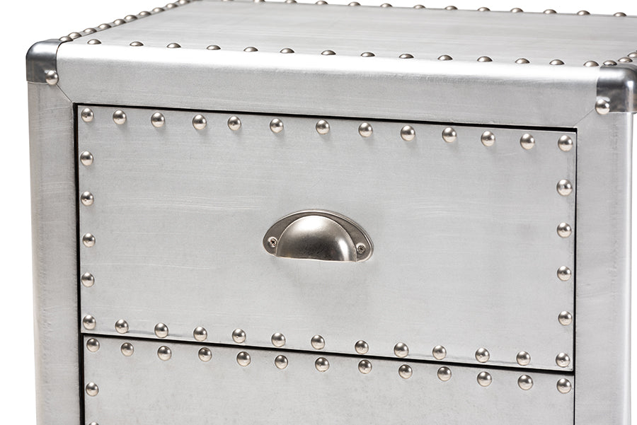 Bring chic French industrial style into your space with the Mari end table. Constructed from silver metal, the Mari features cool rivet detailing along its edges. Two drawers provide space to keep items organized and out of sight. Polished silver metal drawer pulls add a sleek touch. Inspired by vintage storage trunks, the Mari features corner protectors. Thick tapered feet complete the look. Use this stylish piece as an accent in the living room or any shared space. The Mari end table is made in China and will arrive fully assembled.