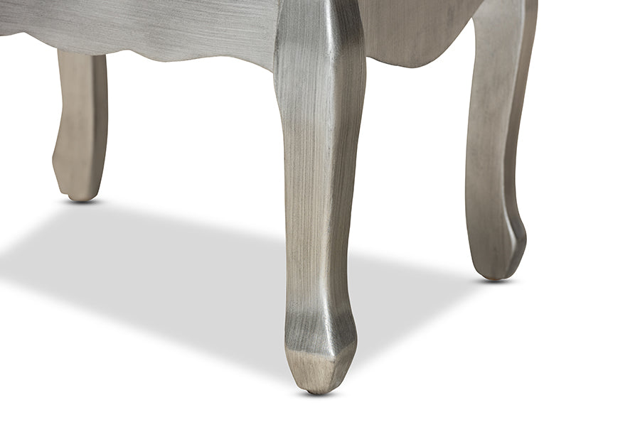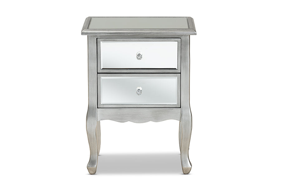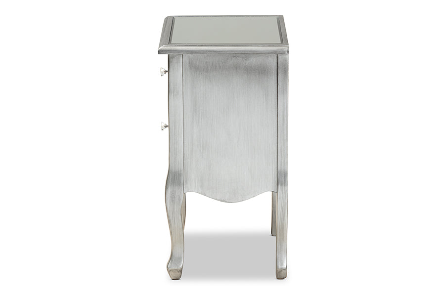 With its stunning metallic tones, the Jaclyn end table brings a touch of glamour to any space. This sturdy wood end table displays a brushed silver finish that gives a cool, contemporary update to its classic French-inspired silhouette. Two drawers provide space to store a variety of household essentials. Mirrored glass on the drawers and tabletop magnificently capture and reflect the surrounding light within the room. Faux crystal knobs and cabriole legs lend an extra touch of glam. The Jaclyn end table is made in China and will arrive fully assembled.