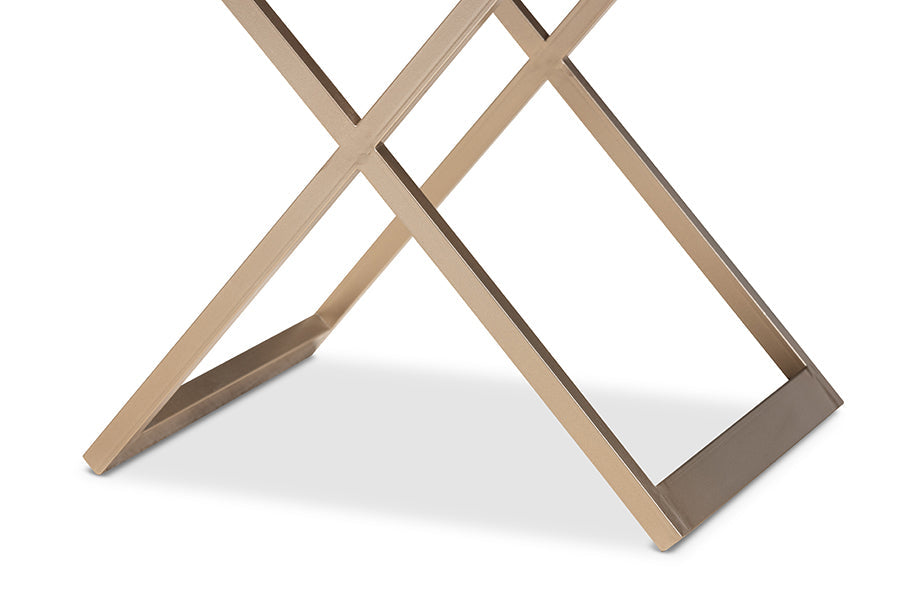 Brighten up your interior with the modern glamour of the Marelli end table. Made in China, the Marelli is fitted with one drawer and features a large, square tabletop for all your household needs. The Marelli is supported by powder coated brass effect metal legs in a crisscross design, giving the entire piece an alluring, retro style. Fully assembled, a gold-tone metal handle adorns the drawer for an extra dose of glam. The black finish contrasts wonderfully with the brass effect on the metal, making the Marelli an outstanding choice to enhance any space.