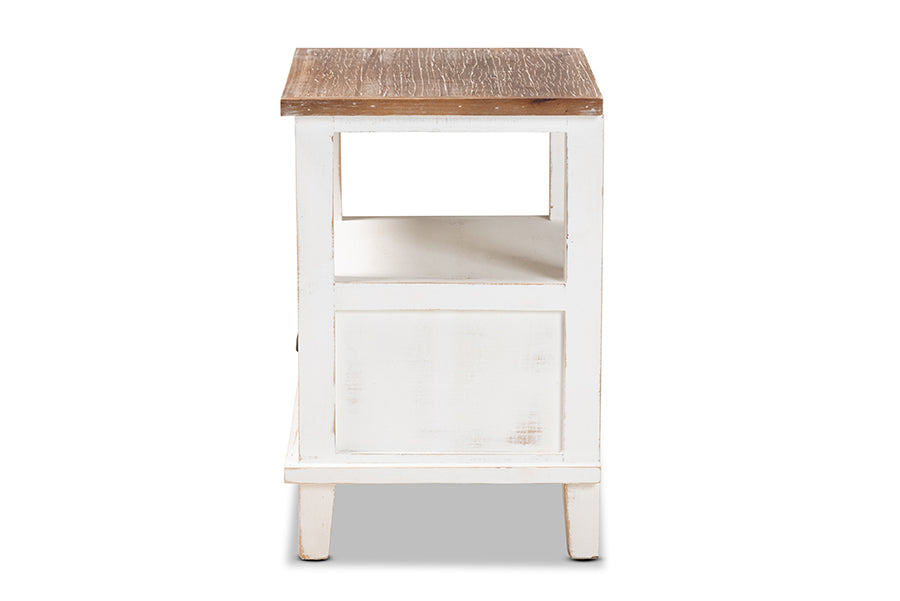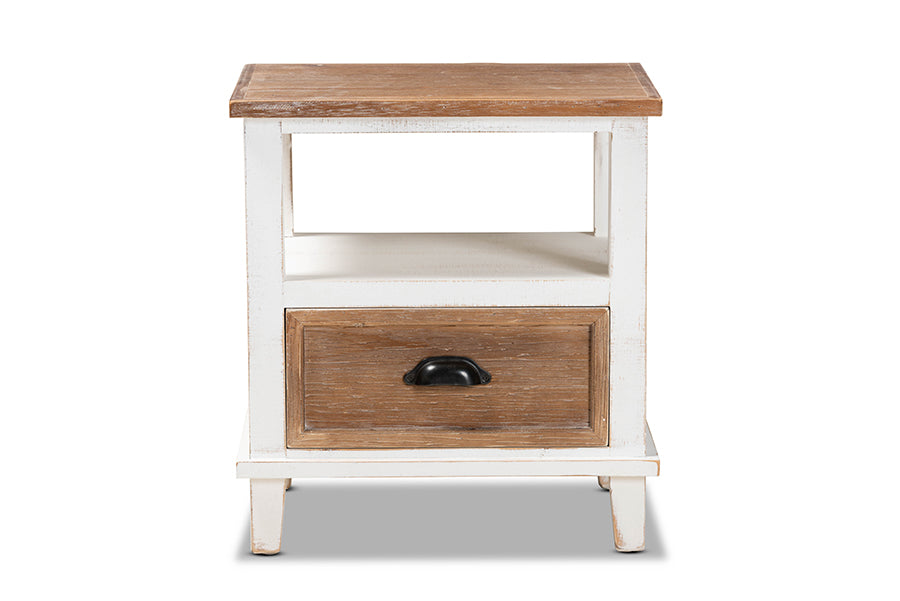 Upgrade your space with the charm and convenience of the Iara end table. Made in China, the Iara is comprised of a sturdy wood frame showcasing a lightly weathered two-tone white and oak brown finish for an aged look. One drawer and one shelf provide ample storage options for a variety of household essentials. Fully assembled, the Iara is accented with a black finished metal handle for a touch of modern appeal. A compact piece brimming with character, the Iara end table adds quality to any space.