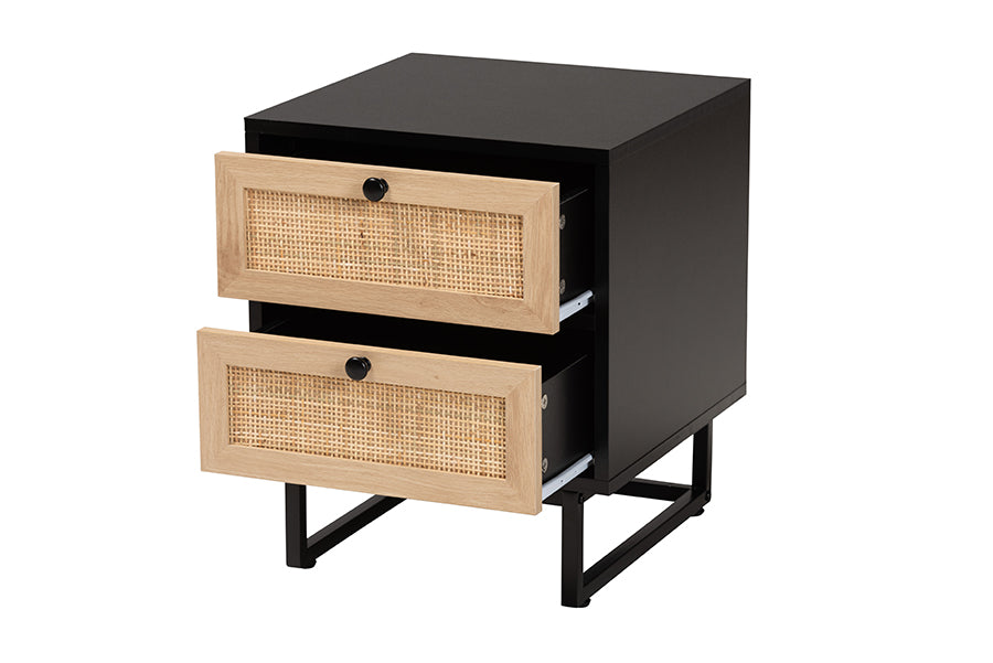Give your home a breath of modern flair with the Leonie end table. Made in China, this lovely piece consists of wood frame resting atop a solid metal base. Two drawers offer space to organize household essentials while reserving the tabletop for daily use. The Leonie requires assembly and features woven rattan drawer fronts for a touch of classic artistry. Round drawer knobs complete the look, making the Leonie end table an exquisite addition to any arrangement. Due to the nature of the natural materials used in this product, it may have variations in areas such as, but not limited to, color, pattern, grain and texture. The hair-like strands of rattan/rattan-fiber are common due to nature of the material.