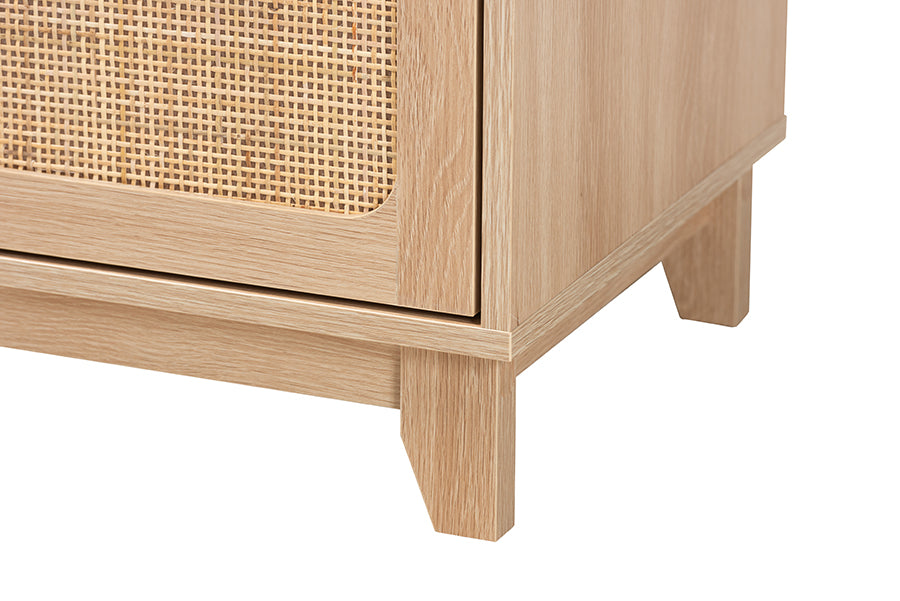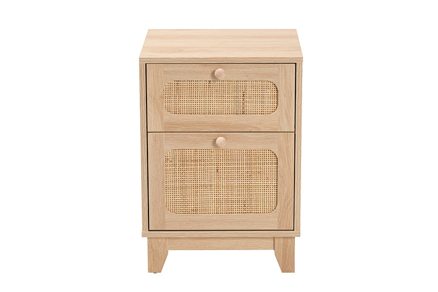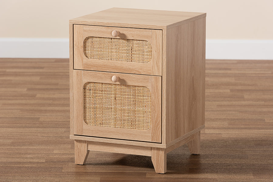 Exemplary of classic design, the Ogden end table offers fantastic efficiency in robust style. Made in China, this mid-century inspired piece is comprised of a sturdy wood frame embellished with woven natural rattan. One drawer offers convenient storage of household essentials, while an additional shelf behind the door accommodates larger items. The Ogden requires assembly and features tapered legs for excellent stability and support while maintaining a sleek silhouette. A round drawer knob lends unique visual geometry, making the Ogden end table an alluring addition to any interior layout.