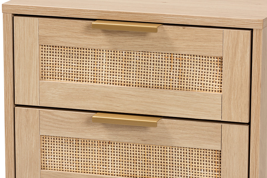 Classic design receives a glamorous update with the stylish and efficient Maila end table. Made in China, this Japandi-inspired piece is comprised of a solid metal base topped with a sturdy wood frame. Two drawers offer superb storage space for household essentials while woven rattan drawer fronts lend a charming, rustic vibe. The Maila requires assembly and features rounded, minimalist legs for excellent stability and support in stunning design. Metal drawer handles complement the glamorous nature of the piece, making the Maila end table a distinguished addition to any space.
