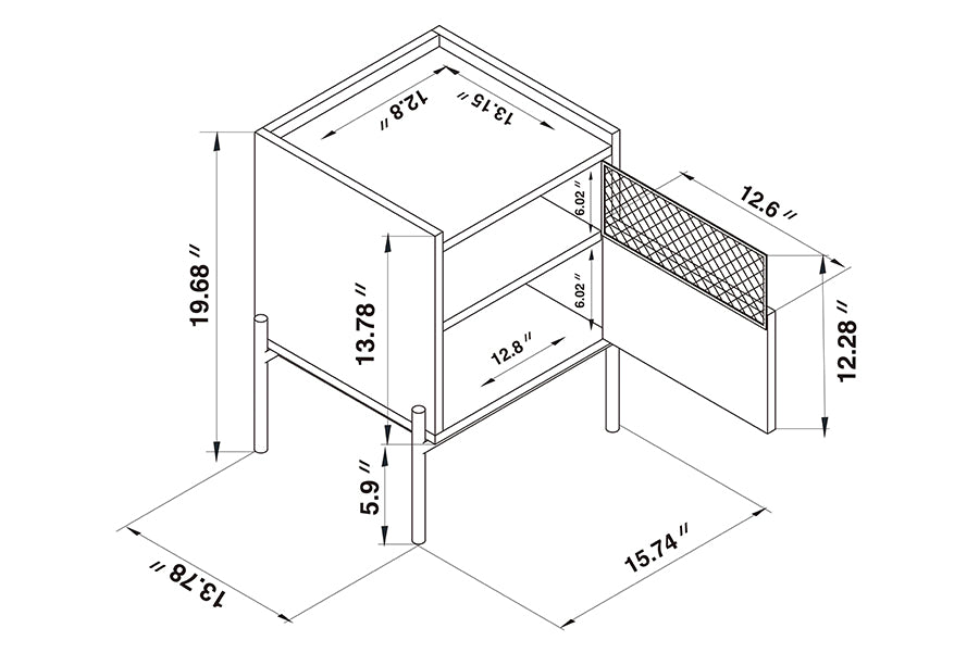 Product Dimensions: Overall Dimensions: 19.70" High x 15.70" Wide x 13.80" Deep; Legs: 5.90" High; Storage Behind Door Dimensions: 12.80" Wide x13.20" Deep x6.00" High; Open Shelf Dimensions: 12.80" Wide x 13.20" High; Door Dimensions: 12.30 "Long x12.60" Wide;
