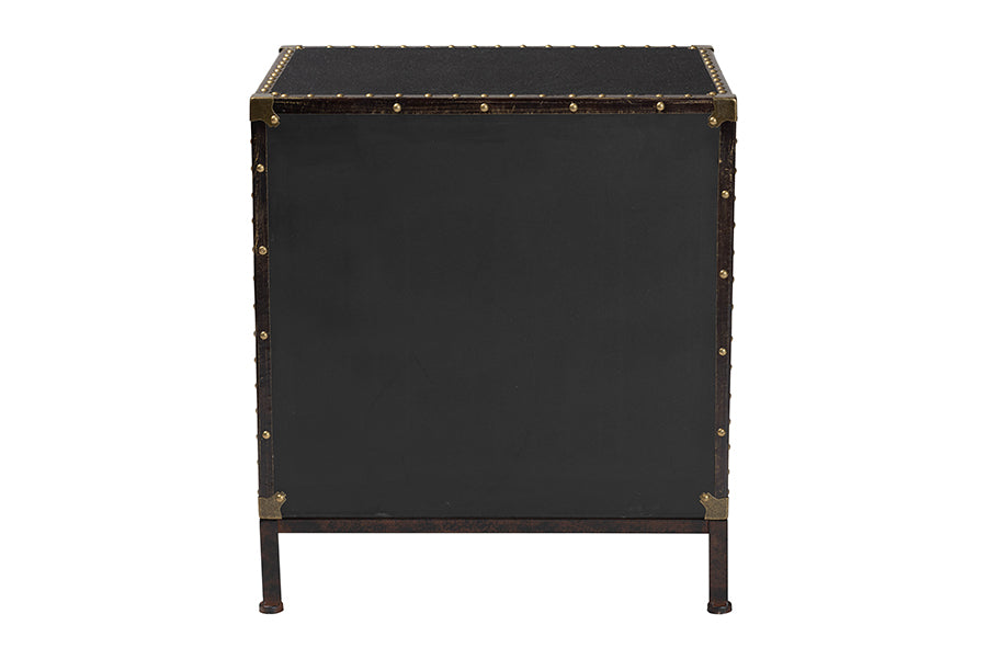 Lend a touch of industrial-style flair to your space with the stunning Lorand end table. Tactfully crafted in China, this vintage inspired piece consists of a sturdy wood frame wrapped in smooth canvas. Metal-plated edges and studded embellishments highlight the robust nature of the piece while two drawers offer convenient storage for a variety of household essentials. The Lorand will arrive fully assembled and utilizes minimalist metal base with rounded legs for excellent stability and support. Beautifully shaped leather strips complete the look, making the Lorand end table an enthralling addition to any space.