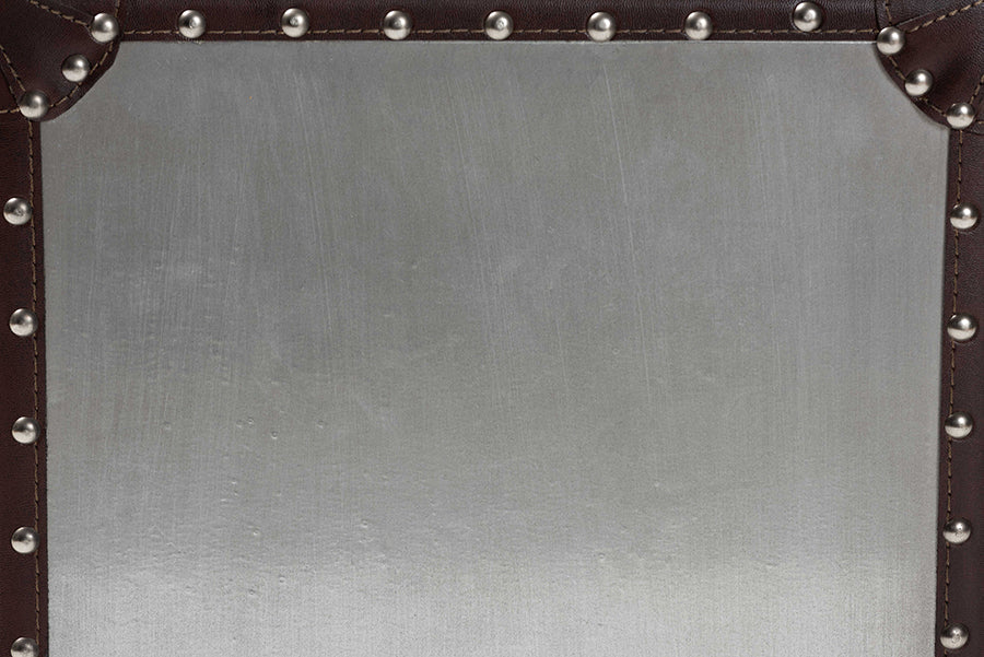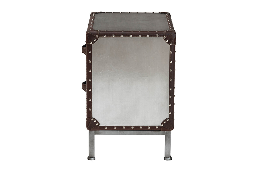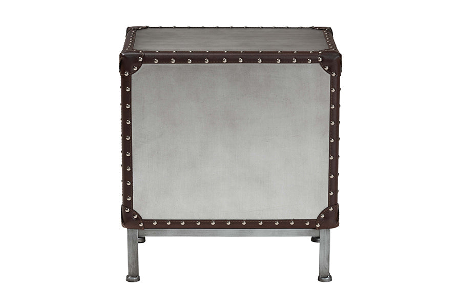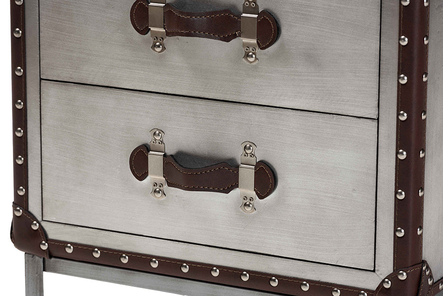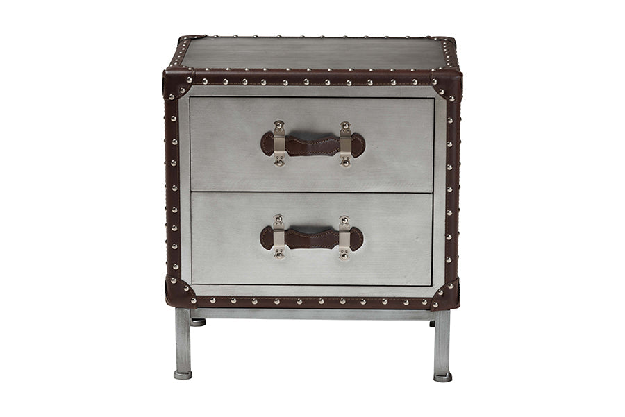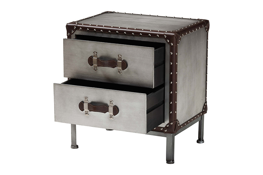 Embellish your interior with the poise of industrial vigor through the stunning Haylie end table. Adeptly crafted in China, this vintage inspired piece consists of a sturdy wood frame ornamented with a sleek metal casing. Two drawers offer convenient storage for household essentials, while reserving the tabletop as a chic display area. The Haylie will arrive fully assembled and is adorned with faux leather handles as well as nail head studded bands for an added touch of robust timelessness. Straight legs with rounded feet complete the look, making the Haylie storage cabinet an enchanting fixture of any layout.