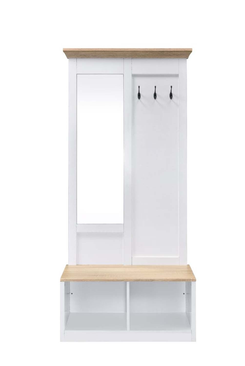 Light oak and white finish complement each other perfectly, giving the whole wooden construction a crisp, clean look. The hall tree features a wooden frame paired with three metal hooks. A body length mirror on the left side provides a full-length view that helps you get ready for the day. It also offers a rectangular bench seat with two open storage compartments underneath for organizing your shoes while saving space.