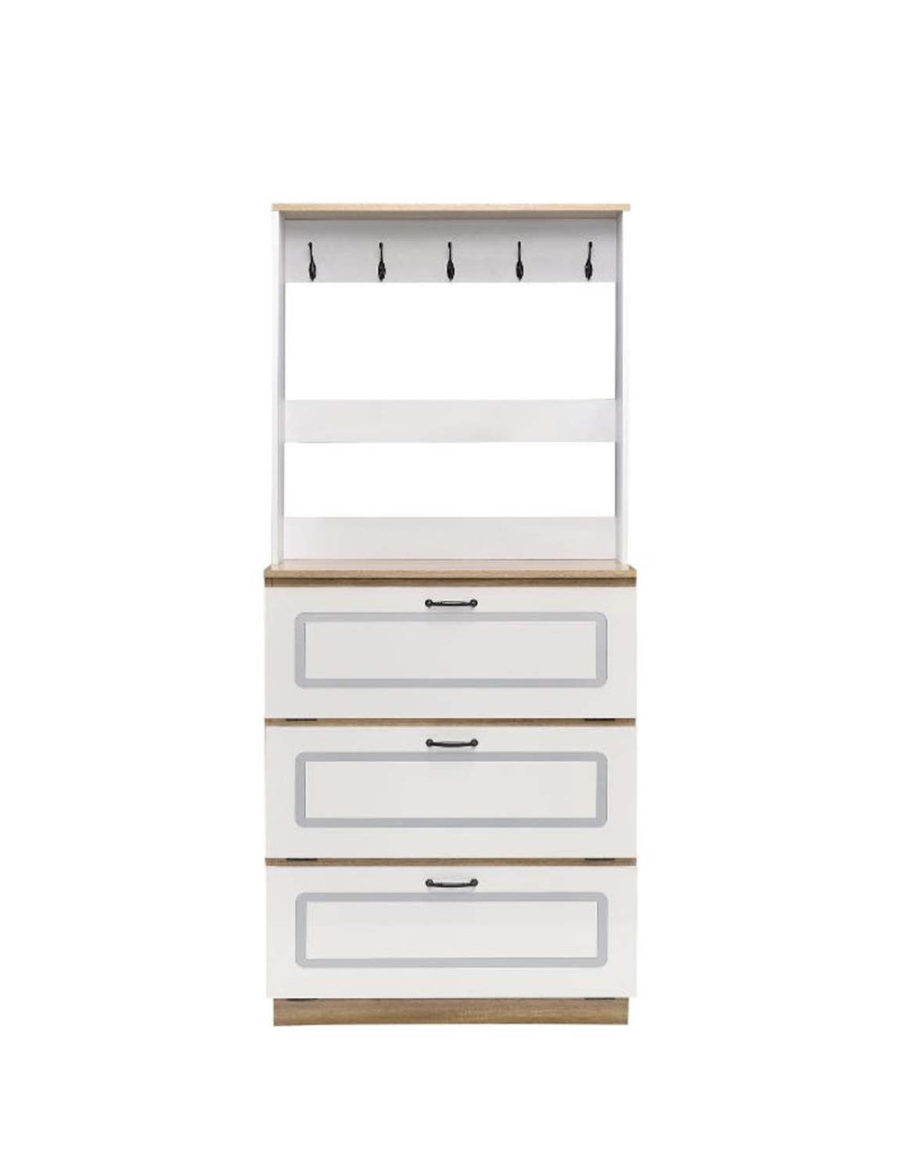 Light oak and white finish complement each other, bringing this piece a calming, breezy look. This shoe cabinet features warm wooden accents paired with rich metal hardware. The cabinet has three drop down drawer that reveal more reachable storages for a dozen pairs of shoes. A hutch above the cabinet offers ten metal hooks for hanging your clothing and coating. Complete your entryway decor with this inviting addition that make your guests feel welcome and appreciated.