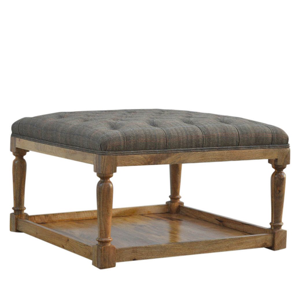 This Turned Leg Upholstered Footstool is upholstered a 100% multi tweed seat and constructed from 100% solid mango wood and has a beautiful oak-ish finish, that will bring a whole new look to your home. The attractive country tweed design with the rich colour of the wood and upholstered multi tweed on the top makes it a superb piece of furniture to look at that is also highly functional, with a shelf providing space for magazines, books etc. You may encounter variations from batch to batch hence if you are looking to pair products under similar room settings; you can opt for a bespoke order or take an informed decision about the possible variations.