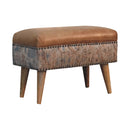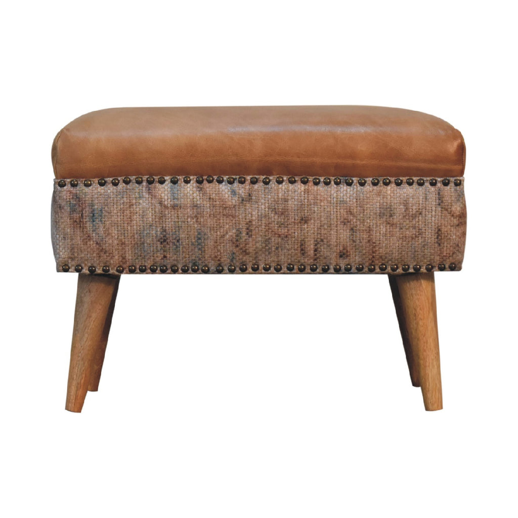 Featuring a durrie acid wash printed rim with a buffalo leather hide seat, this square footstool has solid mango wood legs that have an oak-ish finish, ensuring it is stable and durable in the home and provides a beautiful contrast with shiny brass studs on the rims, it is a multi functional meaning it can be used both in the living room and bedroom.