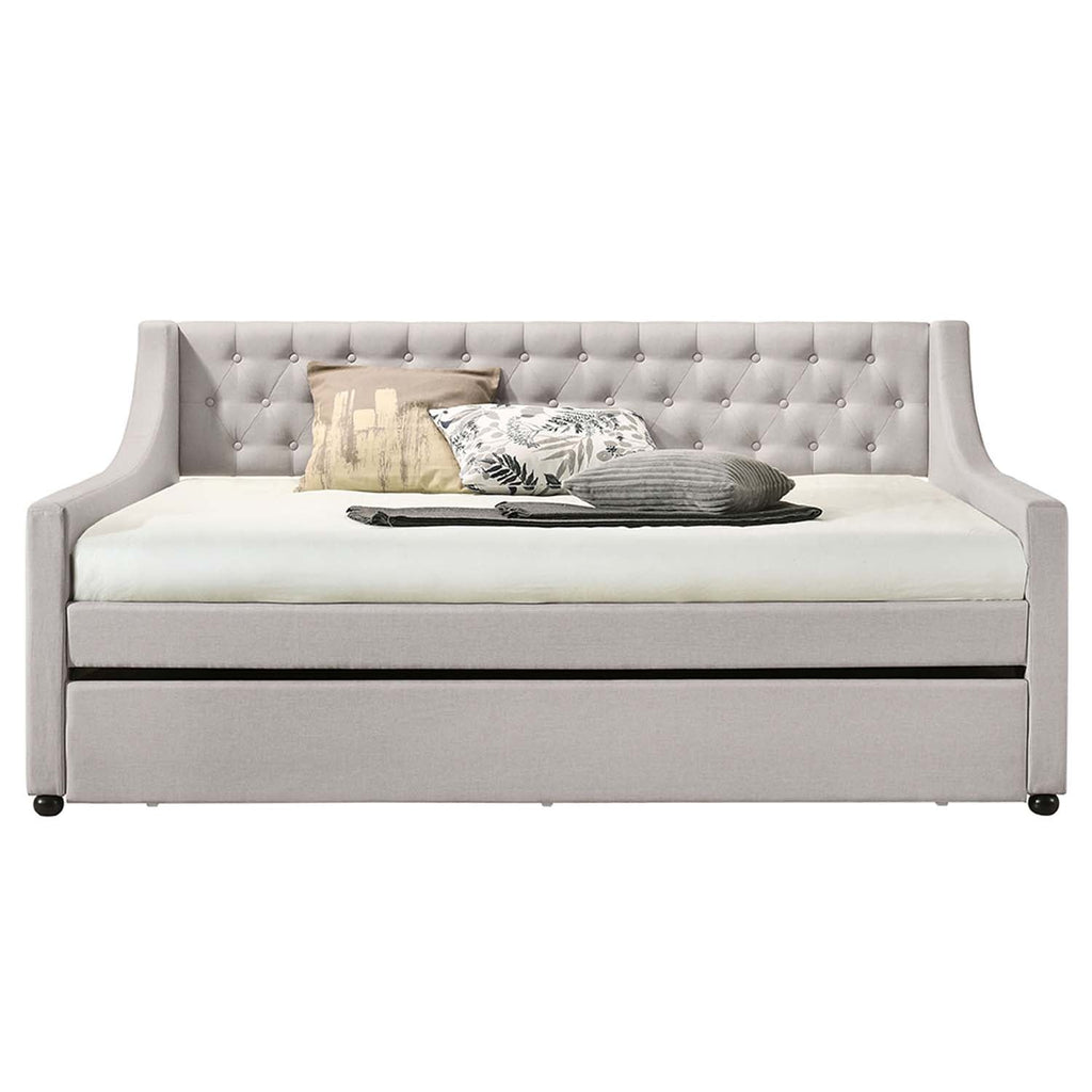 The fully upholstered daybed embodies a classic aesthetic infused with rich textures. Wooden frame is graced with gentle curves and elegant details while button-tufted fog fabric upholstery makes you indulge in a luxurious comfort. An additional trundle underneath the daybed offers extra sleeping option for overnight guest. Beautiful, comfortable and space-saving, the Lianna Daybed is one of the most versatile pieces you don't want to miss.