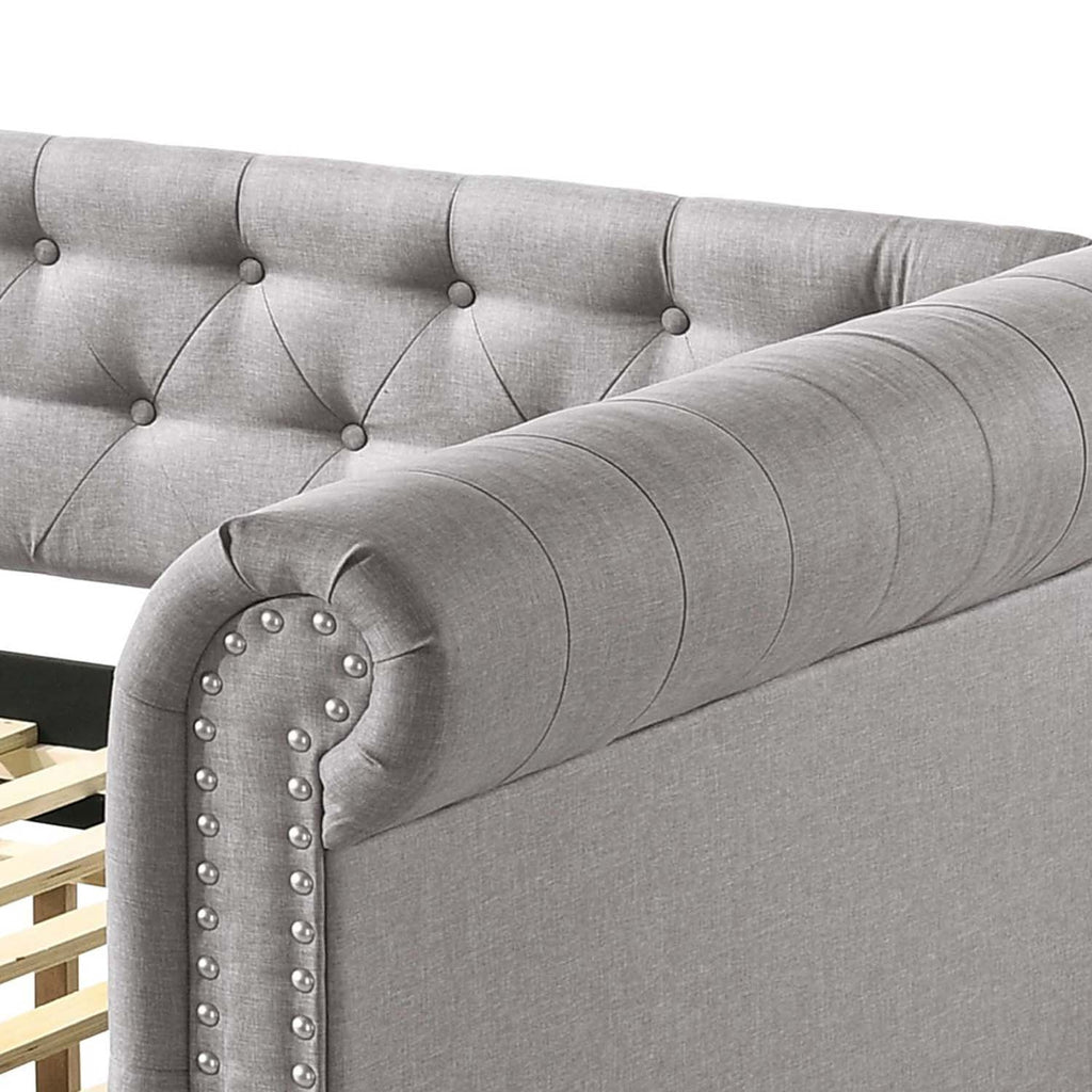 The fully upholstered daybed embodies a classic aesthetic infused with rich textures. This timeless piece features a chesterfield button-back design while smoky gray fabric upholstery makes you indulge in a luxurious comfort. An additional trundle underneath the daybed offers extra sleeping option for overnight guest. Beautiful, comfortable and space-saving, the Justice Daybed is one of the most versatile pieces you don't want to miss.