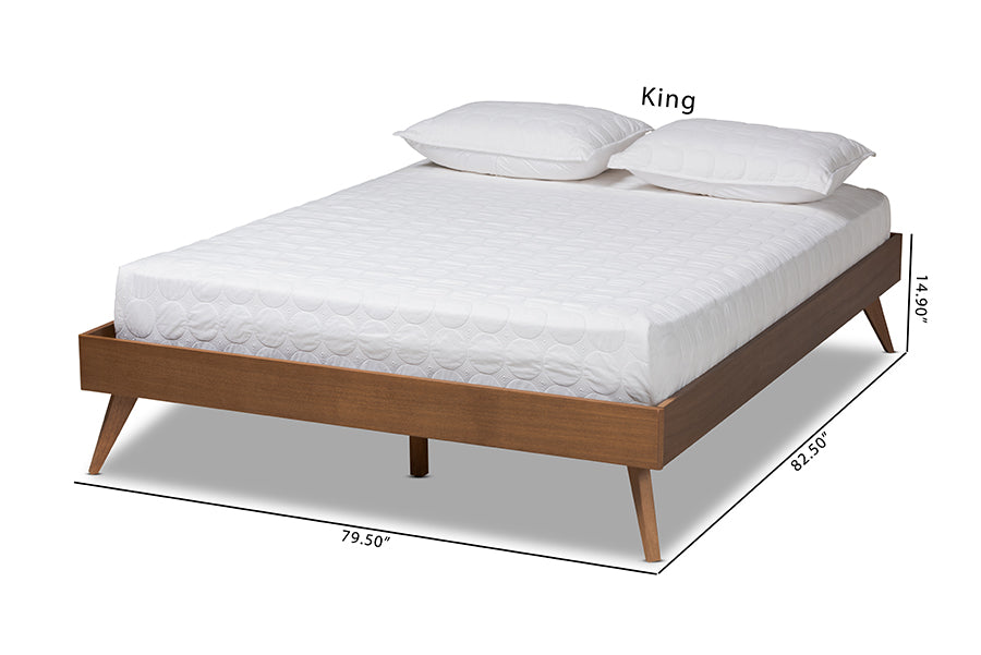 Revamp your bedroom with the retro charm of the Mabyn bed frame. Built with a sturdy wood frame, the Mabyn features a warm walnut brown finish that complements any color palette. Its low platform and angled, tapered legs are reminiscent of cool, mid-century modern design. Add some crisp white sheets and a plush duvet to complete the look. This bed includes wood slats, which eliminate the need for a box spring. The Mabyn bed frame is made in Malaysia and requires assembly.