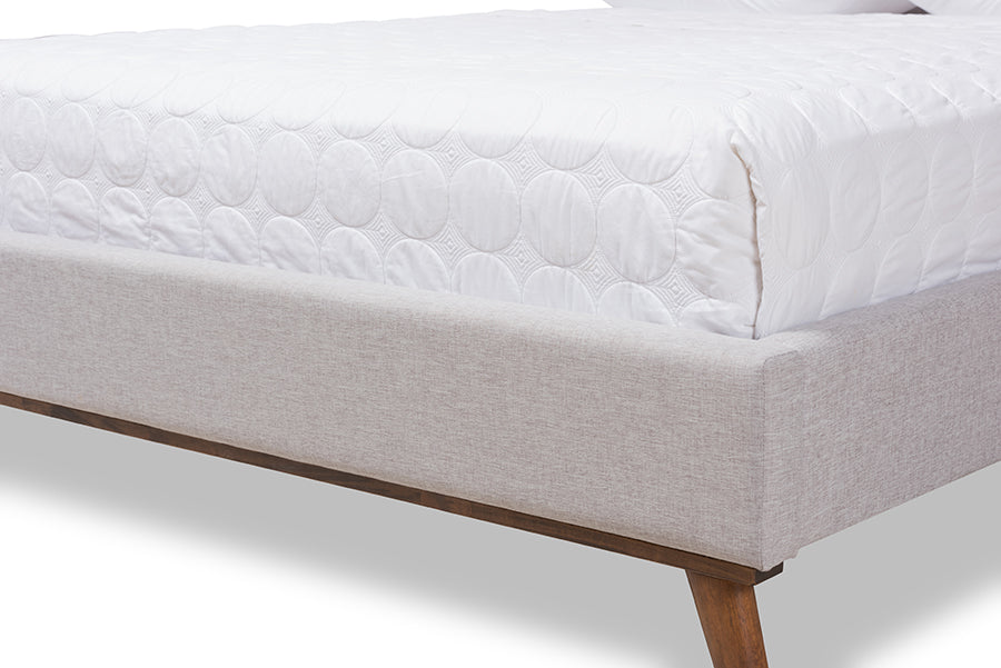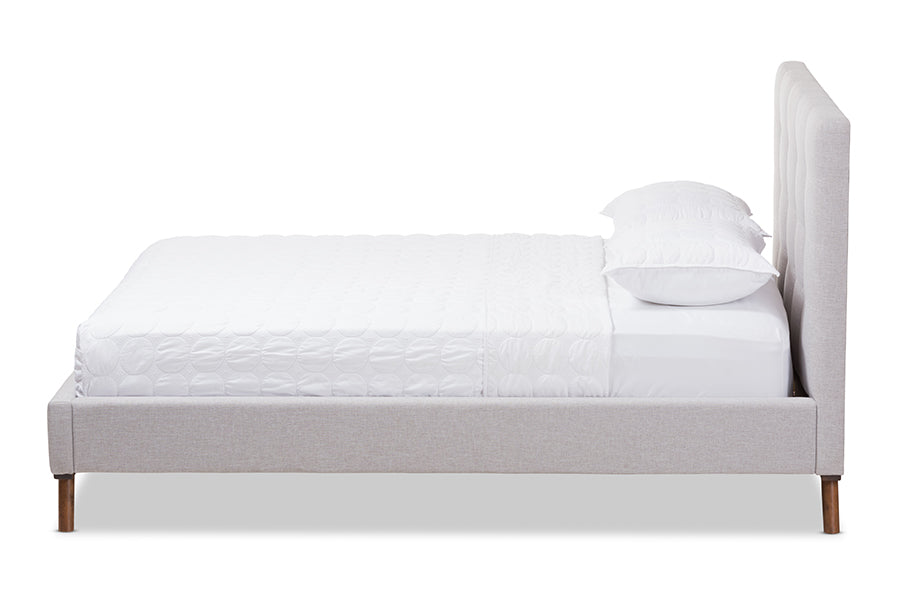 A classic, minimalist design features modern accents with walnut finished tapered legs crafted from solid rubberwood that extend out contrasting against upholstered headboard and foot board, the Genna platform bed adds modern details to create a sleek setting with a timeless appeal. Constructed of solid rubberwood frame and plywood, the Genna is fully padded and upholstered in smart looking light grey or dark grey fabric for a plush and inviting look. Medium height headboard features button tufting design with grid lines detailing for a handsome look, the Genna offers a contemporary, pared back design to create a serene setting for relaxation and escape. Made in Malaysia, the Genna requires assembly.