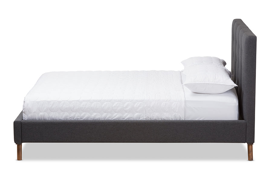 A classic, minimalist design features modern accents with walnut finished tapered legs crafted from solid rubberwood that extend out contrasting against upholstered headboard and foot board, the Genna platform bed adds modern details to create a sleek setting with a timeless appeal. Constructed of solid rubberwood frame and plywood, the Genna is fully padded and upholstered in smart looking light grey or dark grey fabric for a plush and inviting look. Medium height headboard features button tufting design with grid lines detailing for a handsome look, the Genna offers a contemporary, pared back design to create a serene setting for relaxation and escape. Made in Malaysia, the Genna requires assembly.