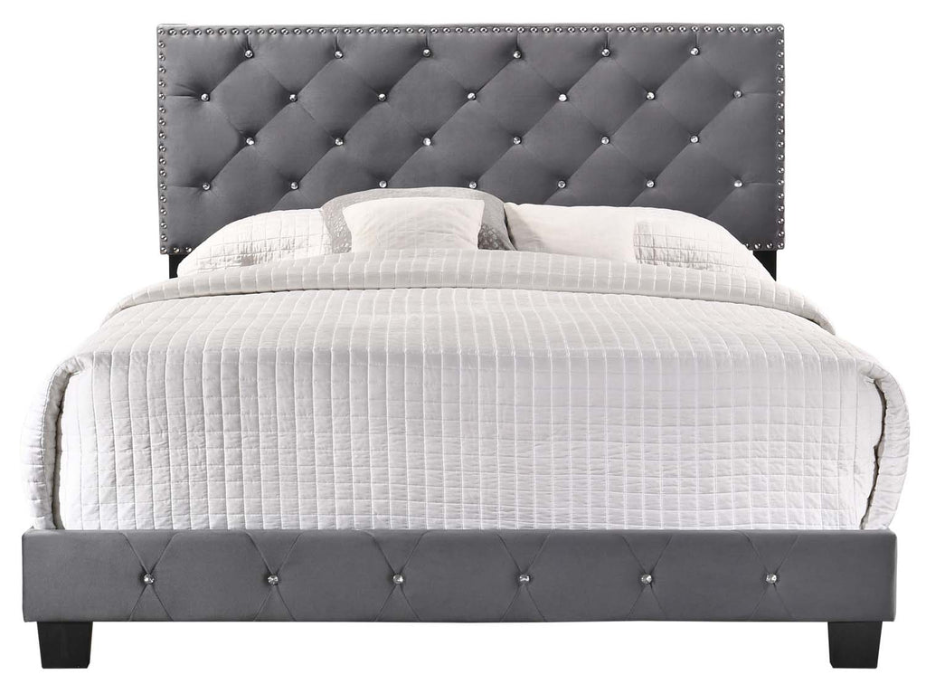 Elevate your bedroom with this beautifully crafted bed featuring a deep tufted upholstered headboard and footboard that bring a luxurious, tailored look to your space. Wrapped in soft velvet with sparkling jeweled tufting, it adds a touch of glamour from every angle. Chrome nail heads outline the silhouette for a refined finish, while sturdy wood supports ensure lasting durability. Designed for use with a box spring or foundation, this bed blends elegance, comfort, and stability in one stunning centerpiece.