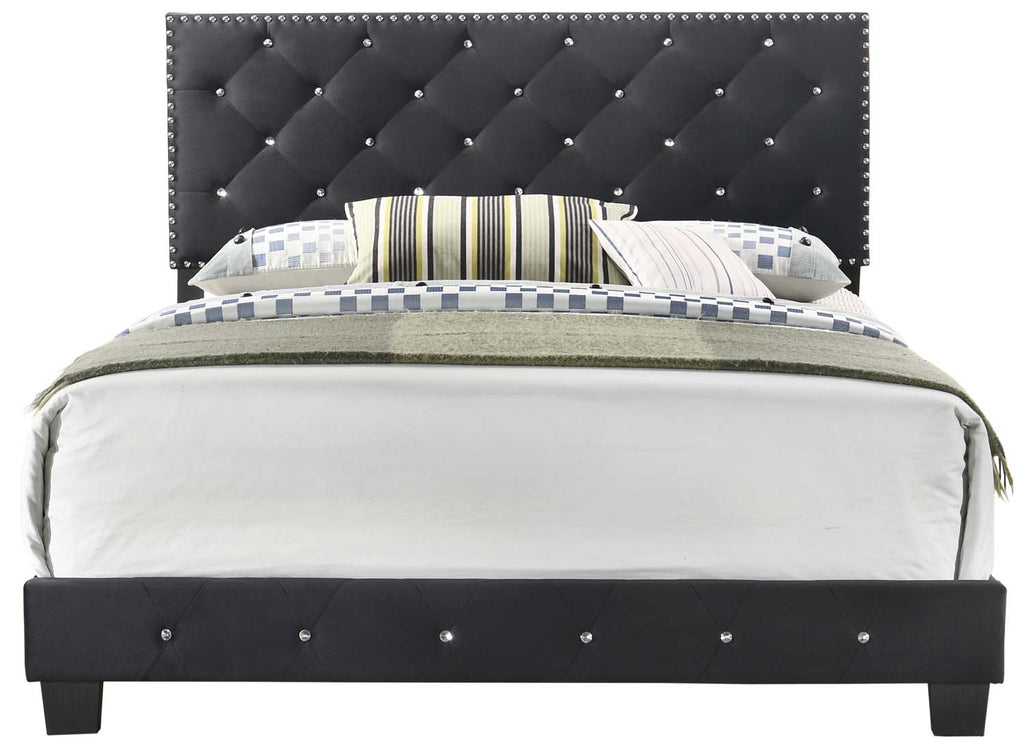 Elevate your bedroom with this beautifully crafted bed featuring a deep tufted upholstered headboard and footboard that bring a luxurious, tailored look to your space. Wrapped in soft velvet with sparkling jeweled tufting, it adds a touch of glamour from every angle. Chrome nail heads outline the silhouette for a refined finish, while sturdy wood supports ensure lasting durability. Designed for use with a box spring or foundation, this bed blends elegance, comfort, and stability in one stunning centerpiece.