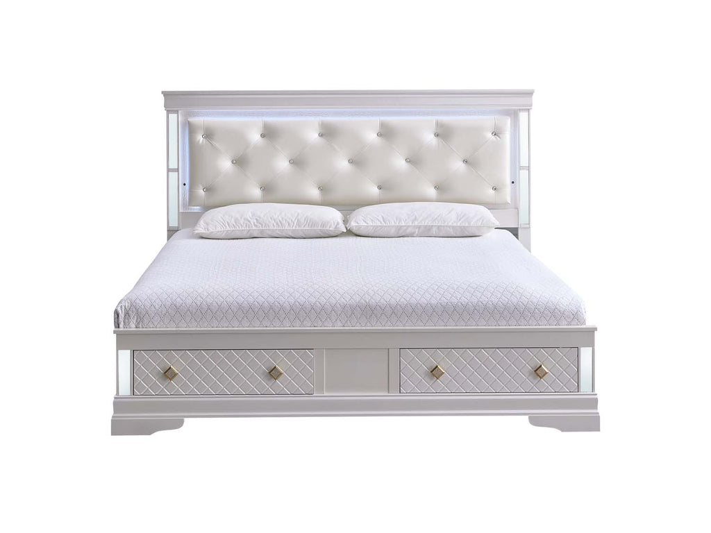 This bed brings together modern elegance and everyday functionality, creating a refined centerpiece for any bedroom. The upholstered, diamond-tufted headboard offers a plush and inviting look, enhanced by soft built-in LED lighting that adds a subtle ambient glow. Mirrored side accents elevate the design with a touch of contemporary sophistication. The footboard includes convenient storage drawers featuring a stylish lattice pattern and sleek hardware, making it easy to keep essentials organized while maintaining a clean, polished aesthetic. Built with a sturdy frame and attention to detail, this bed blends comfort, style, and practicality in one seamless design.