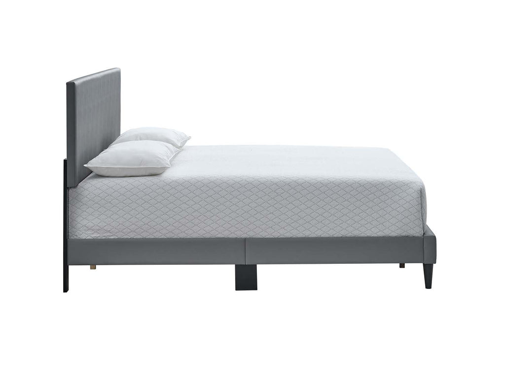 The Baron Platform Bed showcases a sleek profile wrapped in smooth faux leather, bringing a clean, tailored look to any bedroom. Its streamlined edges create a contemporary finish that complements a variety of decor styles. This piece is designed for lasting support and ease of use, featuring sturdy slat construction for queen-size mattresses between 7 and 13 inches in height. The headboard adjusts in height to accommodate your preferences, while the fully upholstered frame softens the bedroom atmosphere with its inviting presence.